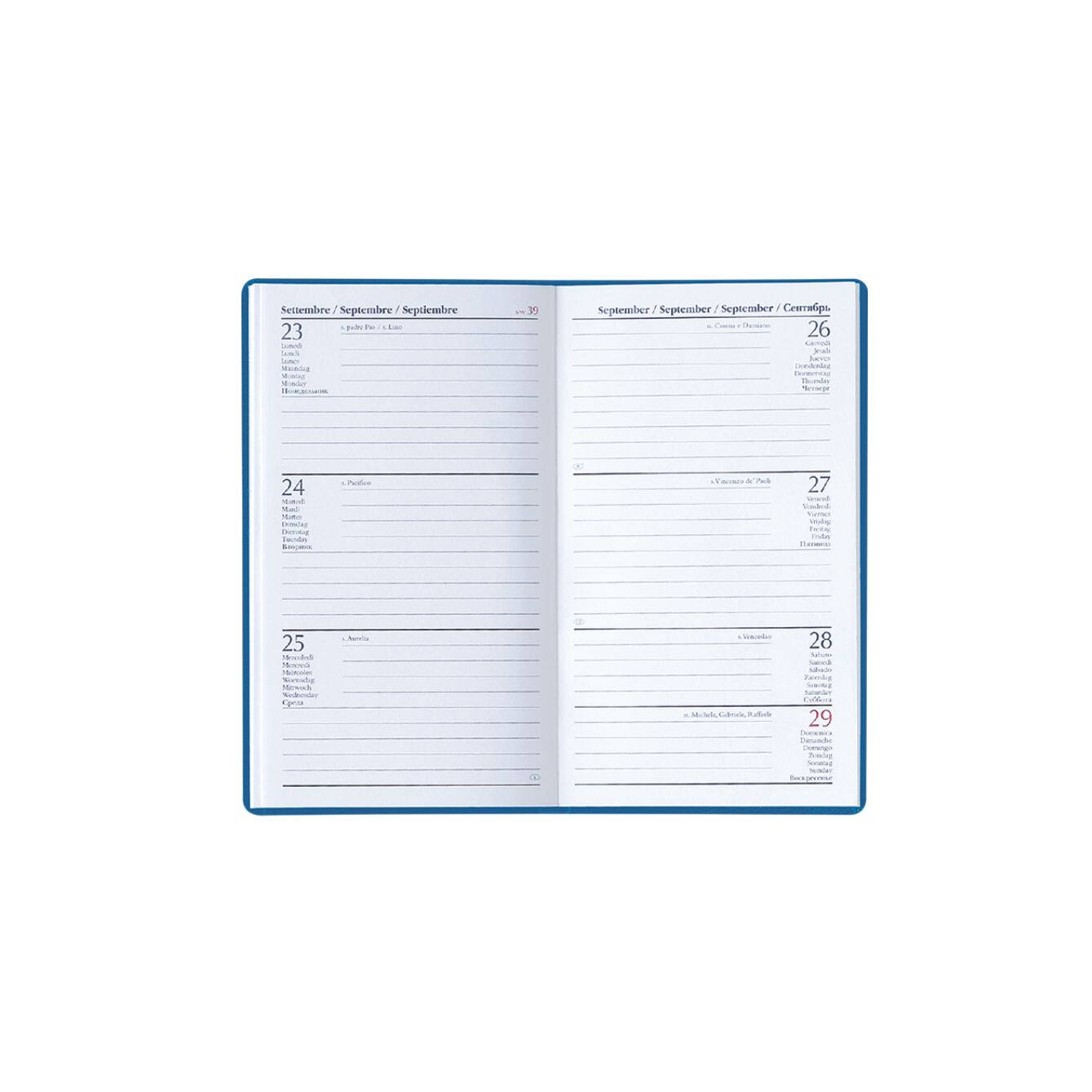 Agendina settimanale in matra. 128 pag. Interno stampa 2 colori. Multilingue, rubrica telefonica, cartina geografica. Colore unico. Dimensioni cm 8x14 Imballo: 100