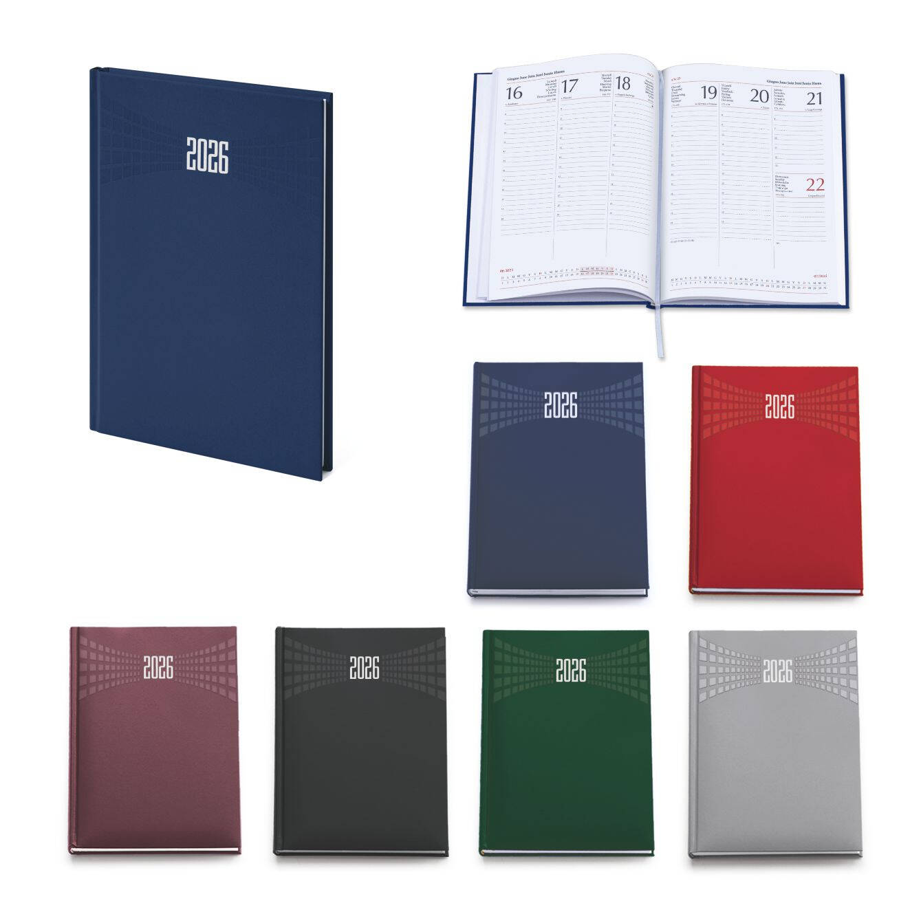 Agenda settimanale in matra. 128 pag. Interno stampa 2 colori. Multilingue. Rubrica telefonica, cartina geografica, piano ferie. Colori: blu, bordeaux, verde, nero, rosso, grigio.. ....... Dimensioni cm 17x24 Imballo: 30xcolore