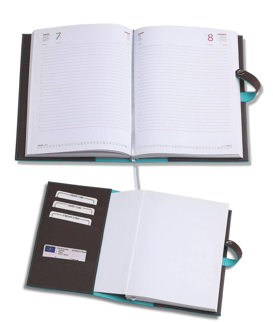 Agenda similpelle. Varie tasche p/card. Interno mobile giornaliero (17x24). Stampa 2 colori. Multilingue. Rubrica telefonica. Carta bianca. Colori: blu, nero, bordeaux, tortora. Confezione in astuccio Dimensioni cm. 24,5x19X19,5 Imballo: 20xcolore