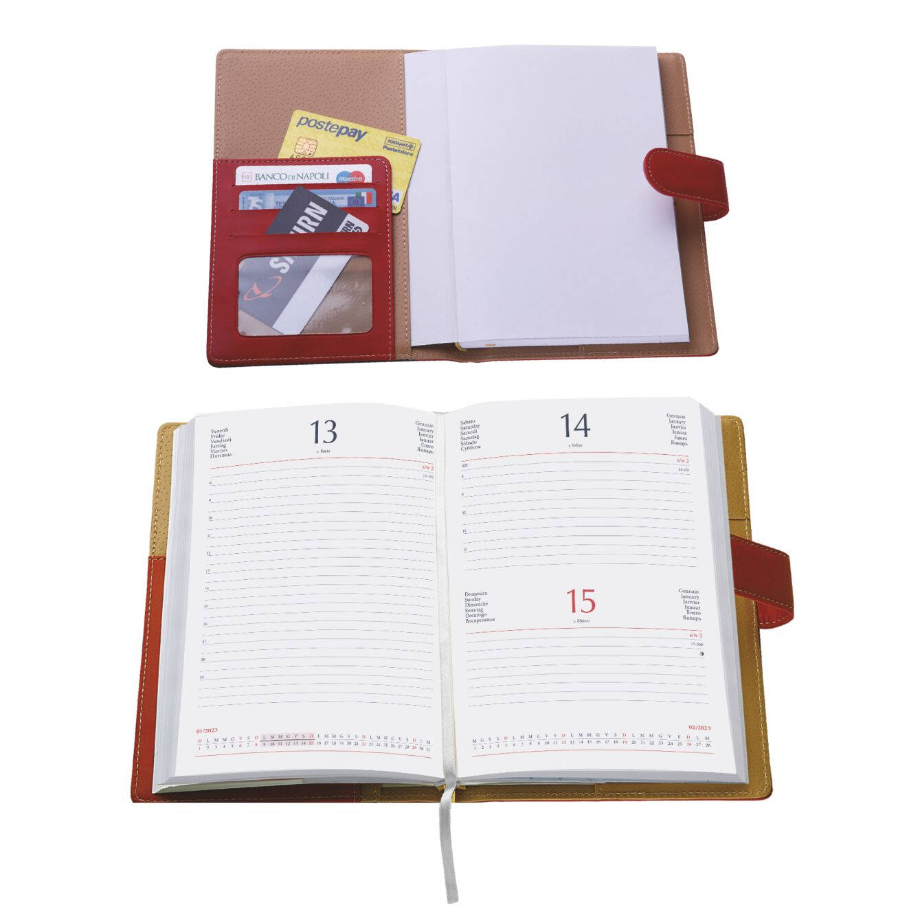 Agenda in similpelle. 320 pag. Vari scomparti interni porta card. Vano porta penna. Interno mobile gior-naliero(15x21). Stampa 2 colori. Multilingue. Sabato e domenica abbinati, rubrica telefonica, carta bianca. Colori: rosso, royal, verde lime, arancio. Confezione in astuccio. Dimensioni cm. 17x22 Imballo: 30xcolore