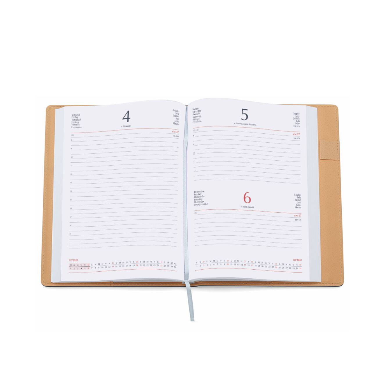Agenda Giornaliera con inserto per penna e tasca esterna Interno estraibile. Termovirante. Dimensioni: cm 17x24, sabato e domenica abbinati, 320 pag. carta usomano bianca 60gr. Confezione in Astuccio. Imballo: 30pz.