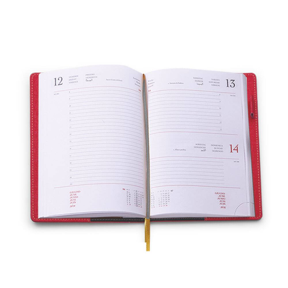 Agenda PU termovirante. Pattina anteriore calamitata, con vari scomparti porta card. Vano porta penna. Interno mobile giornaliero (15x21). Stampa 2 colori. Multilingue. Sabato e domenica abbinati, rubrica telefonica, carta bianca. Colori: rosso, arancio, blu. Confezione in astuccio. Dimensioni cm. 15,5x21,5 Imballo: 20xcolore