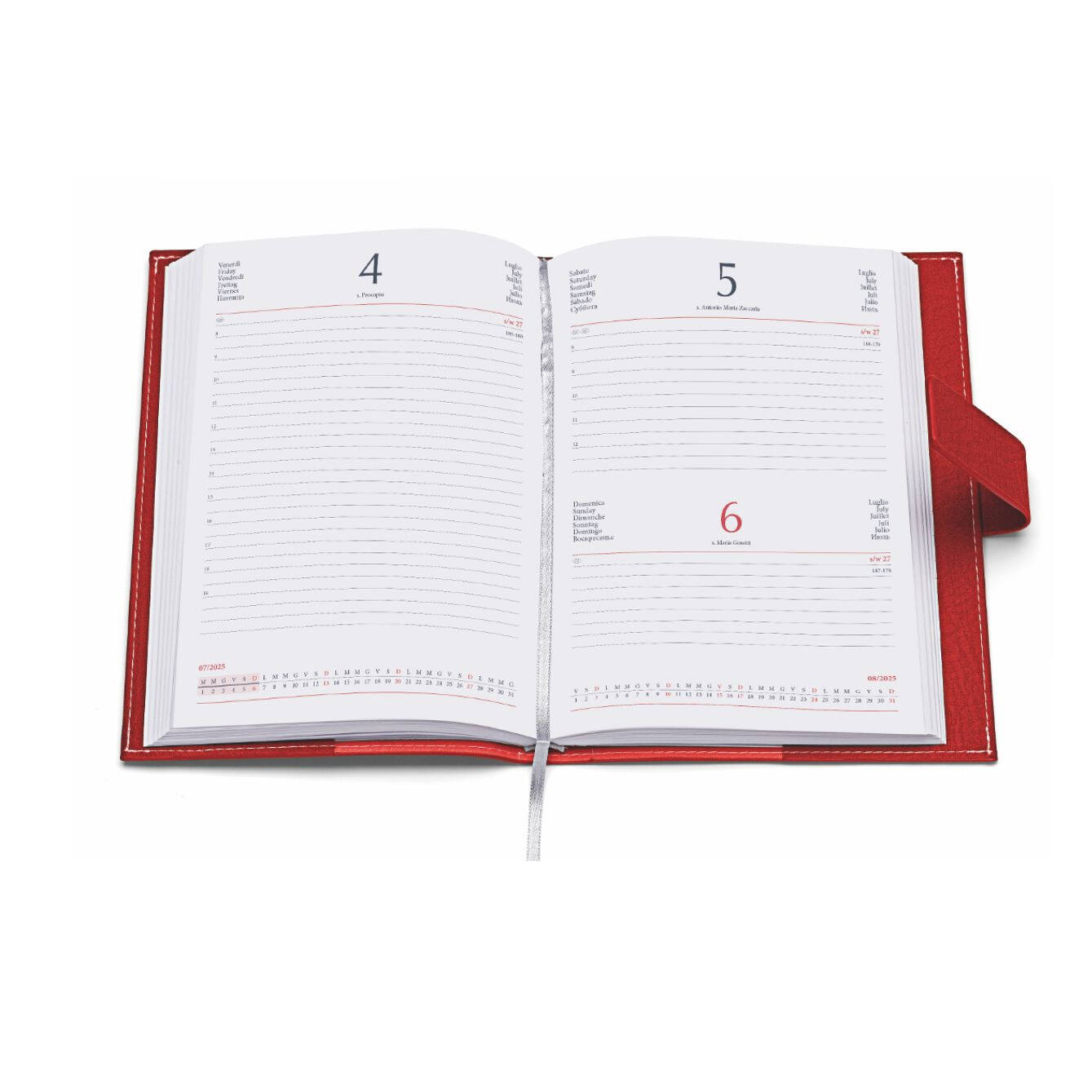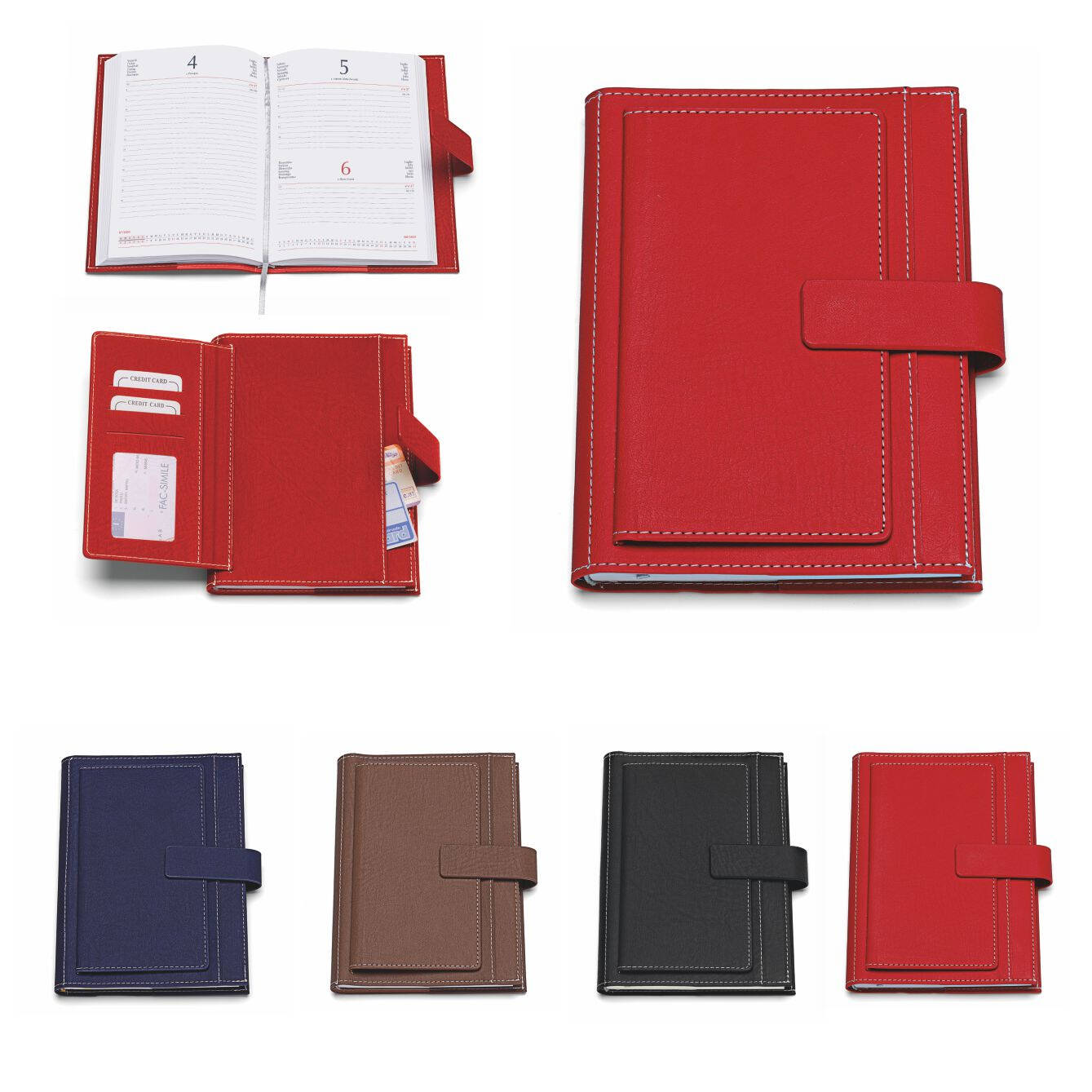 Agenda PU termopvirante. 320 pag. Vari scomparti interni porta card, vano porta penna. Chiusura calamitata Interno mobile giornaliero (17x24). Stampa 2 colori. Multilingue. Sabato e domenica abbinati, rubrica telefonica, carta bianca. Colori: nero, rosso, blu, marrone. Confezione in astuc-cio. Dimensioni cm.17x24 Imballo: 30xcolore