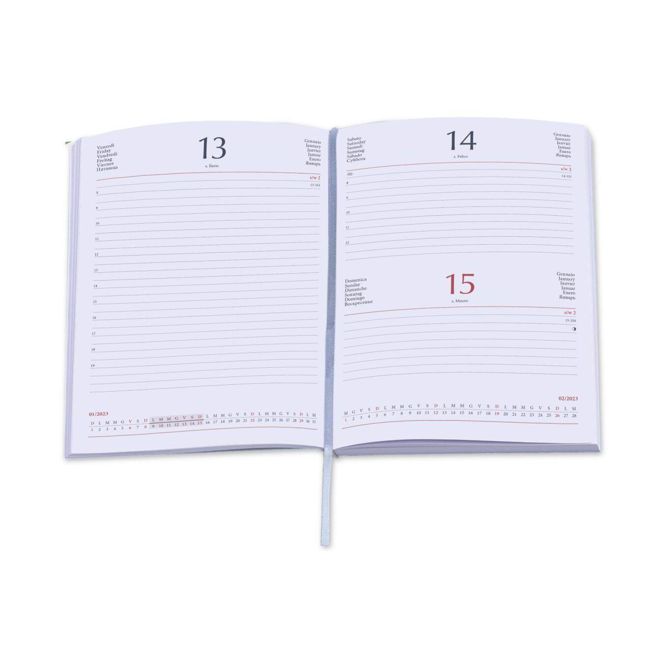 Agenda Giornaliera Flexy Softa a blocco fisso formato A5 sabato e domenica abbinati in PU termovirante, segnapagina, 320 pag. carta usomano bianca 60gr stampata a 2 colori, 4 pag. da 80gr cartina geografica, millesimo stampato a secco. Dimensioni: cm 15x21. Pensata per chi desidera distinguersi con un tocco di classe.