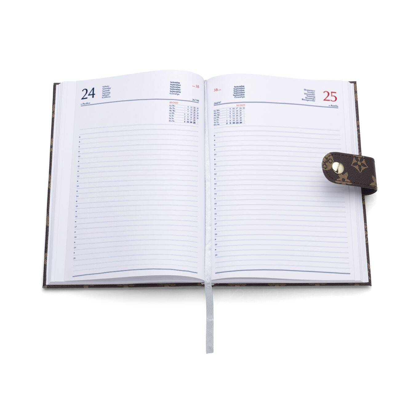 Agenda Giornaliera Lusso a blocco fisso formato A5, in PU termovirante, segnapagina, 400 pag. carta usomano bianca 60gr stampata a 2 colori, 4 pag. da 80gr cartina geografica, placca in metallo oro su copertina. In astuccio Dimensioni: cm 15x21. Versatile, elegante e pronta a seguirti ovunque.