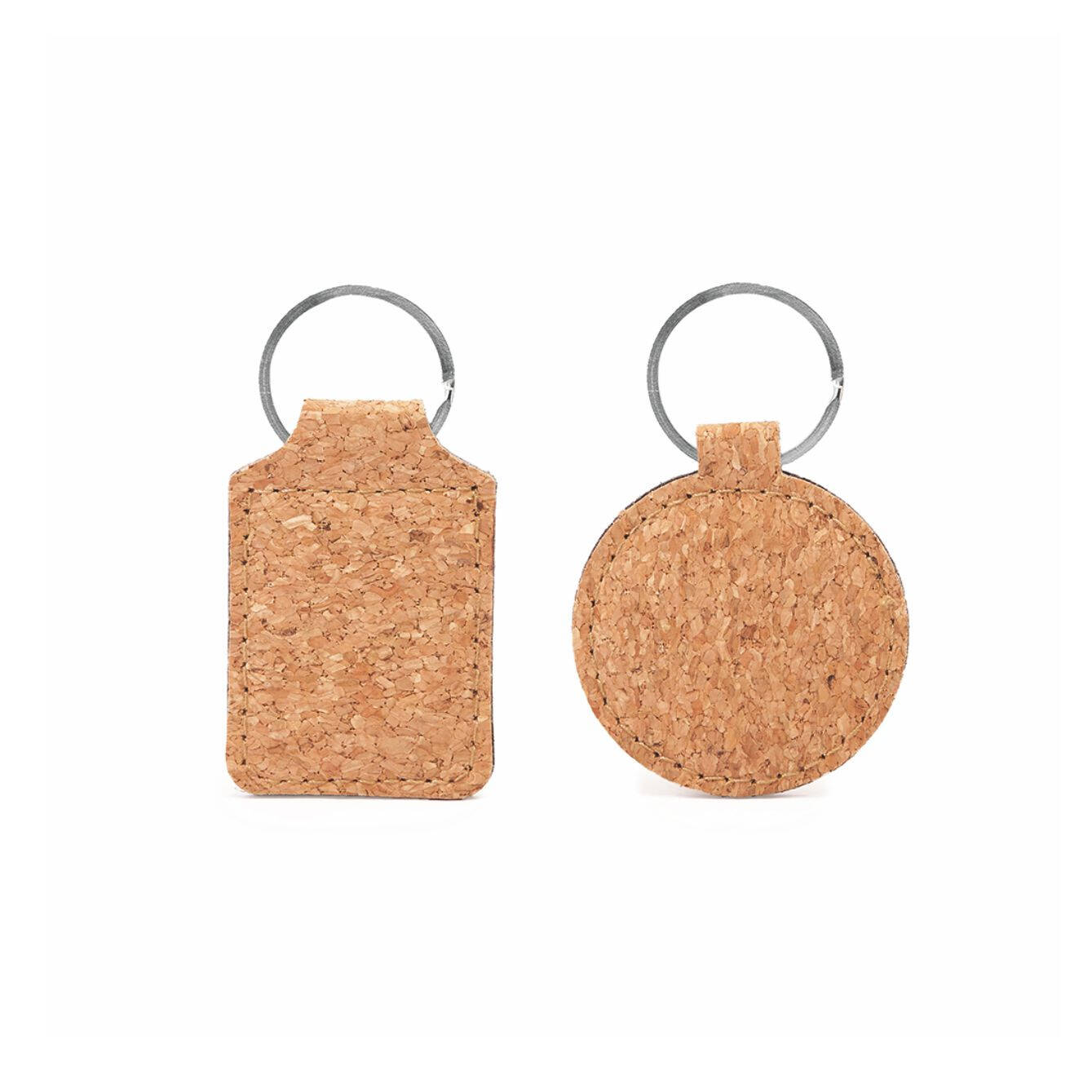 Classico portachiavi in sughero naturale con anello in metallo. Due modelli: rettangolare (3,9 x 0,6 x 8,1 cm) e rotondo (0,6 x 7,9 x 4,9 cm). - Confezione in busta con cartoncino bianco.