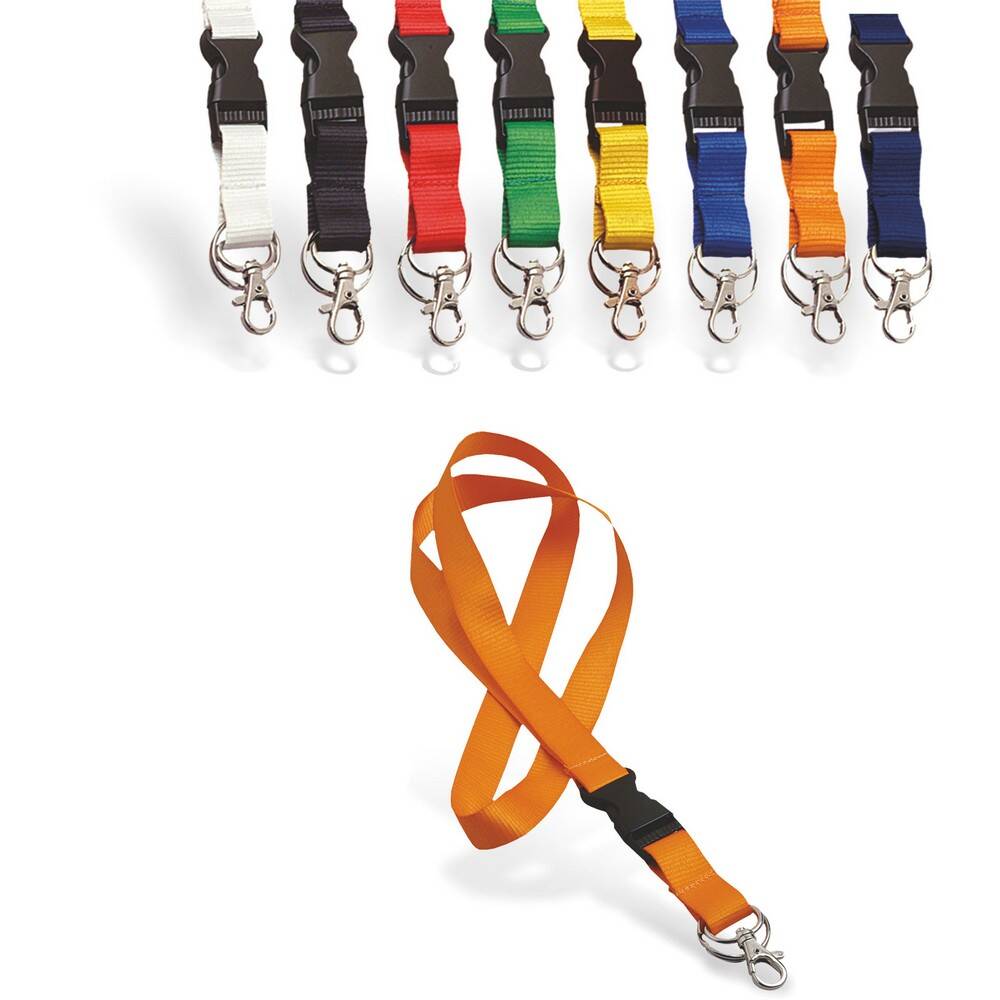 Laccio da collo in poliestere con gancio in metallo. Porta Badge - Aggancio di sicurezza. - Colori: nero, giallo, rosso, royal, verde, arancio, bianco, blu. - Dimensioni cm 53x2. - Imballo: 500xcolore