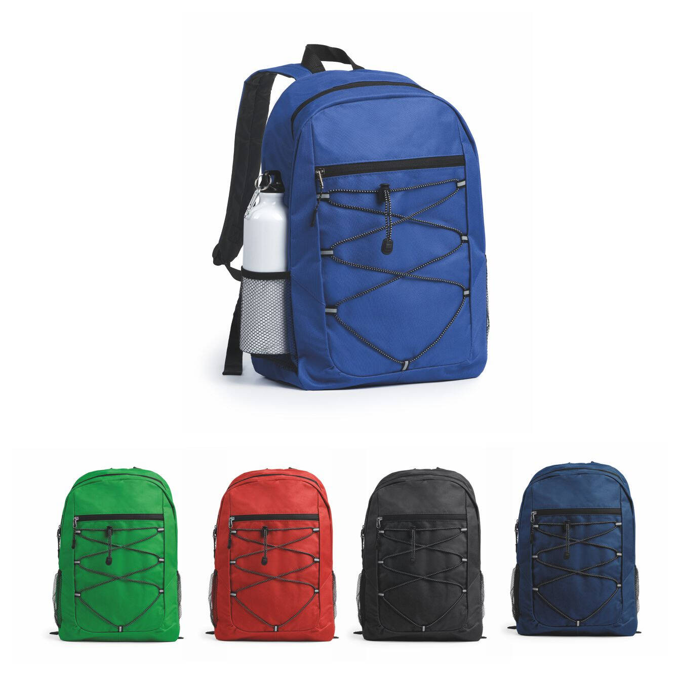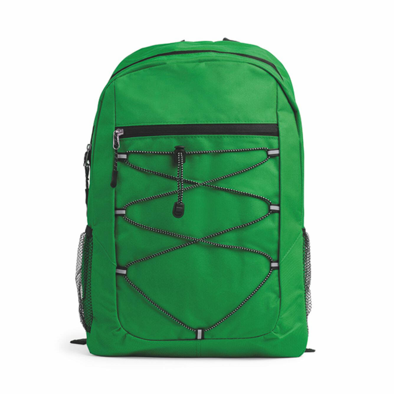 Zaino in poliestere 600D, chiusura con zip, cordino elastico anteriore e tasche laterali in rete. Schienale e spallacci imbottiti. Dimensioni: cm 30x45x14. Imballo: 40pz.