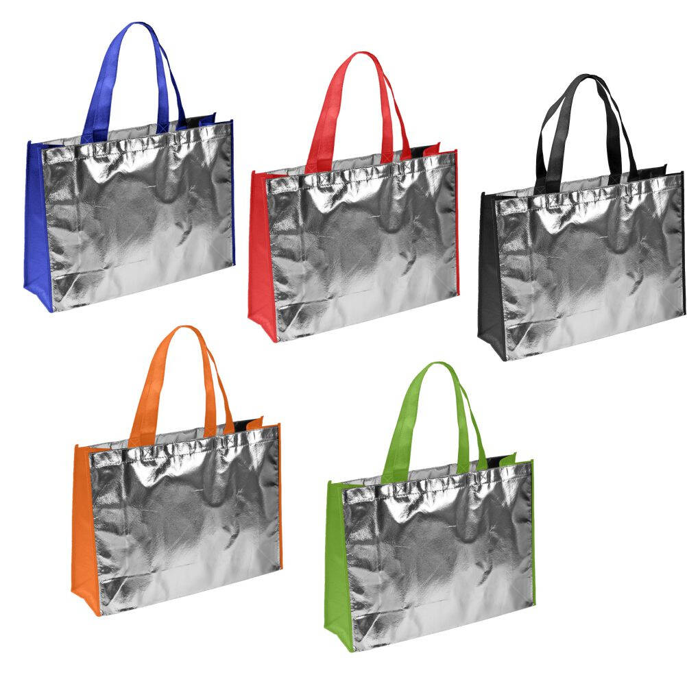 Borsa shopping PP laminato. Cucita. Manici tracolla (cm. 2,4x43) e soffietto colorato (cm.10). Colori: nero, royal, verde, rosso, arancio. Dimensioni cm. 46x33x15 Imballo: 200xcolore
