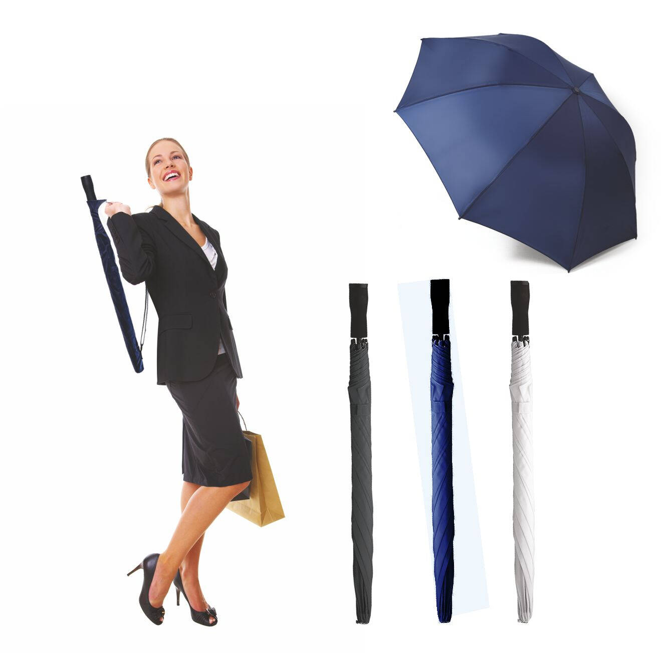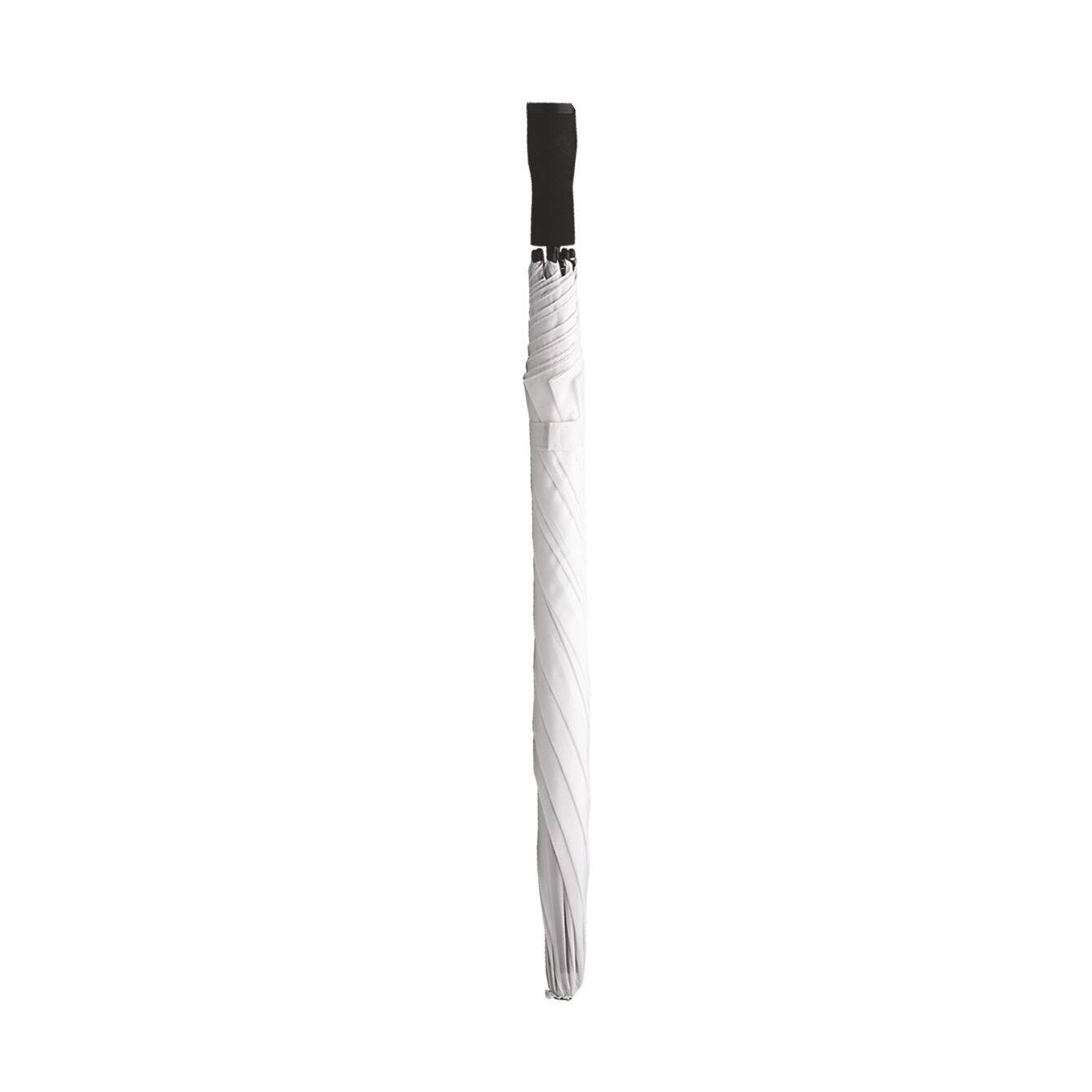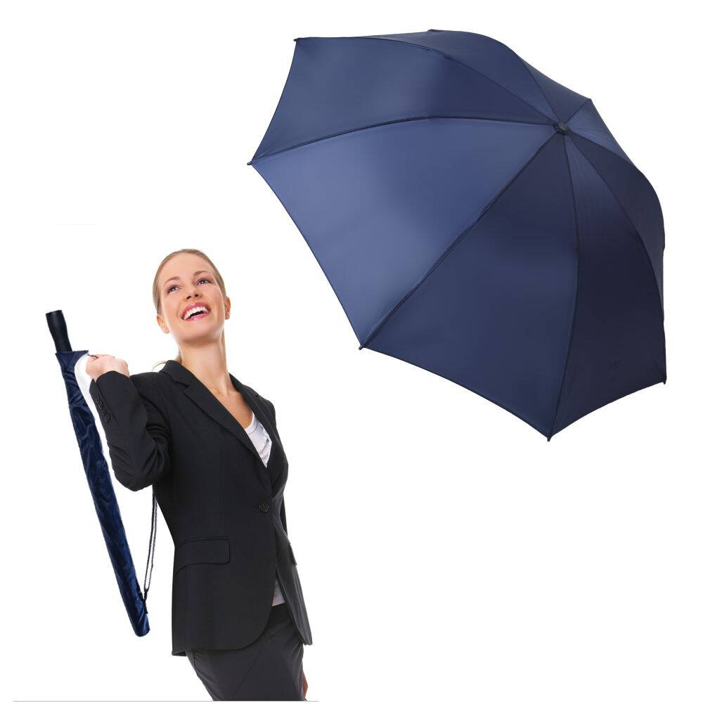 Ombrello manuale in poliestere 190T. Resistente al vento, asta in alluminio. Manico dritto con impugnatura in gomma piuma. Custodia in nylon, corredata di tracolla regolabile per facile tra-sporto a spalla. 8 stecche fiberglass. Colori: blu, bianco. Dimensioni Ǿ cm.92 h. cm.66 Imballo: 60xcolore
