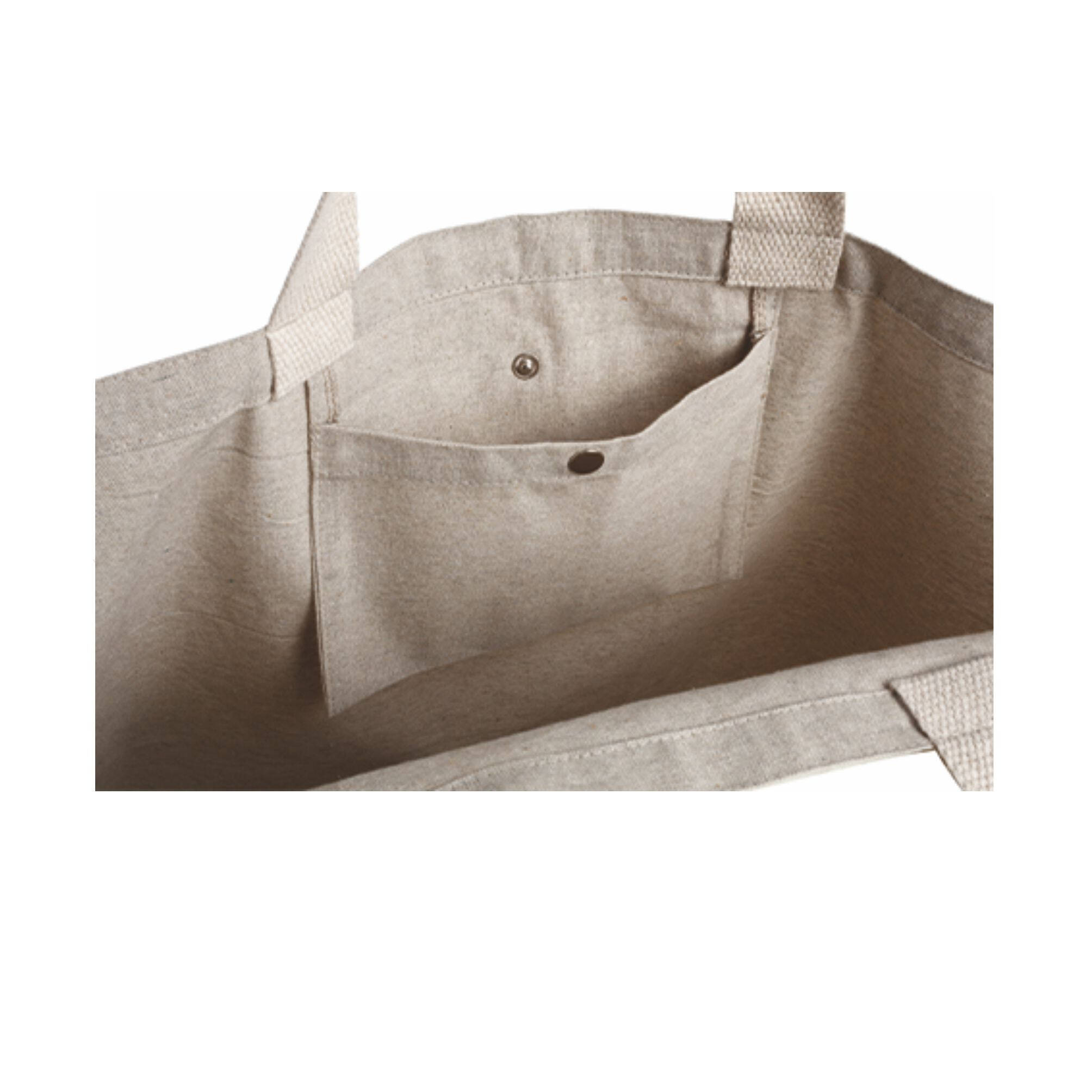 Borsa mare in cotone riciclato 220 g/m² con tasca interna, manici in corda cm 4x60. Dimensioni: cm 39x57x18. Imballo: 50pz.