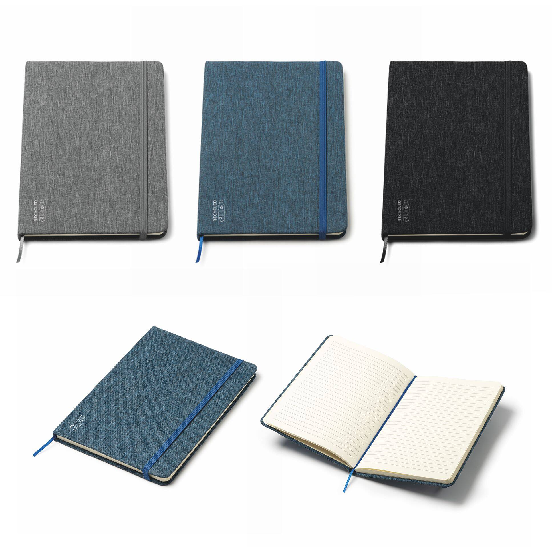 Block notes con copertina rigida in REPT, 80 fogli a righe da 70gr. Confzione in polybag. Dimensioni: cm 15x21x1,5. Imballo: 50pz.