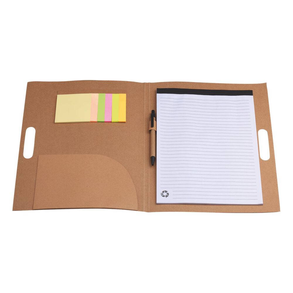 Cartella meeting “Eco”. Composta da: blocco a righe, penna eco, 150 memo stick multicolore. Comodo manico. Cartone gr. 600. Confezione in polybag. Dimensioni cm. 33x23(chiuso) Imballo: 40