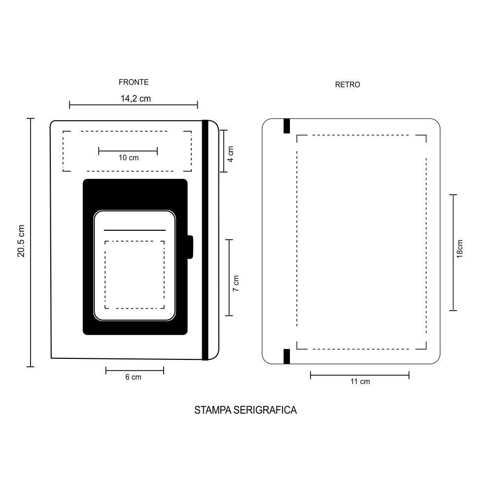 Blocco notes con elastico. PU Termovirante. Varie tasche esterne, p/penna, p/cellulare, p/card. Carta bianca 80 gr.100 fogli/200 pagine. Colori: verde, rosso, nero, blu, bianco e arancio. . Confezione in polybag. Dimensioni: cm.14,2x20,5 Imballo: 30xcolore