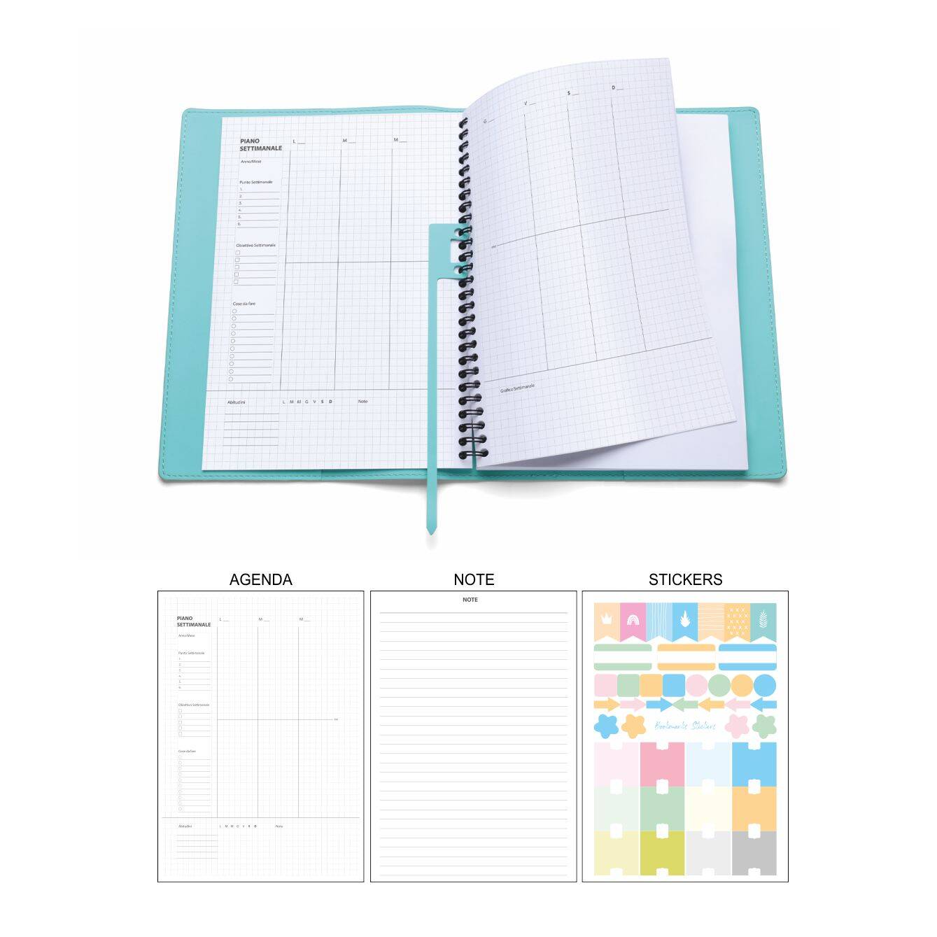 Agenda settimanale perpetua spiralata più notes, composto da 160 pagine da 80gr, di cui 53 pagine di agenda, 18 pagine di notes a righe, in carta riciclata FSC, segna pagine in PU Termovirante, foglio interno con sticker colorati, 2 tasche interne. In astuccio. Dimensioni: cm 16,5x23,5x2. Semplice, raffinata, immancabile nella tua quotidianità.