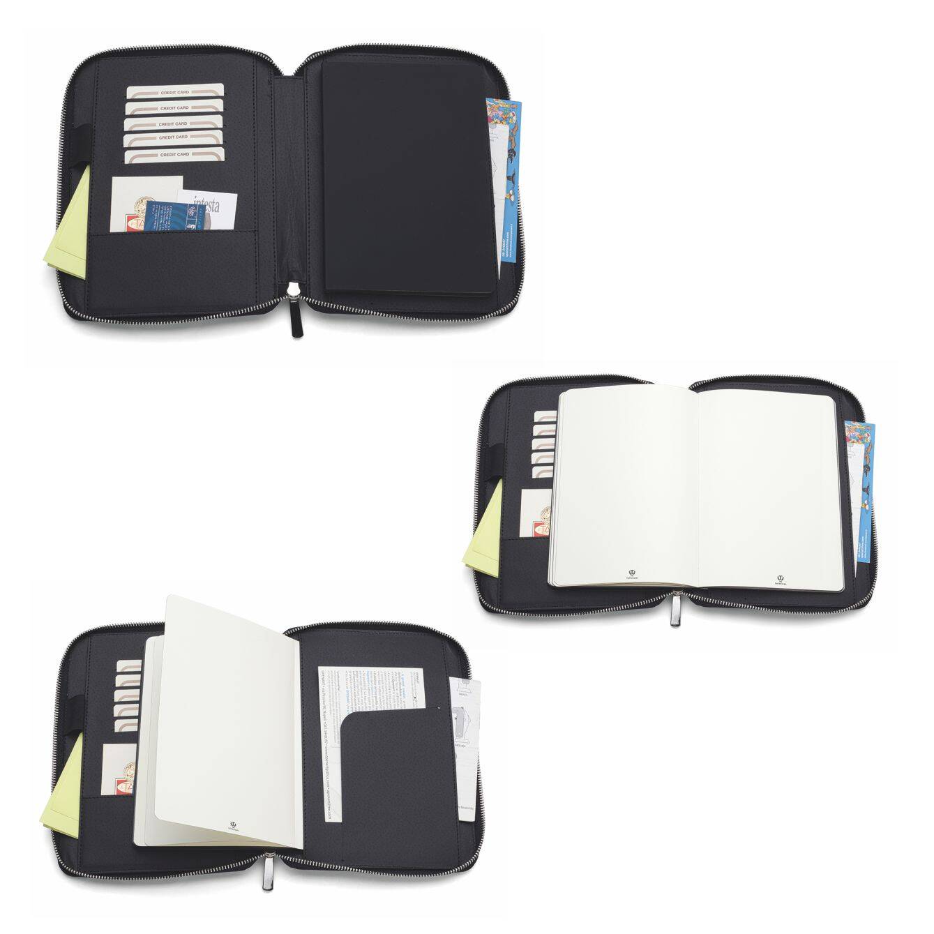 Elegante custodia Tavecchi per block notes in PU Termovirante, block notes formato A5 composto da 80 fogli avana da 80gr con bordo colorato nero, varie tasche portacard, inserto per penna e tasca porta documenti, chiusura con zip. Logo Tavecchi stampato a secco su retro. In astuccio. Dimensioni: cm 19,5x25x2,3. Progettata per garantire massima efficienza con uno stile inconfondibile.
