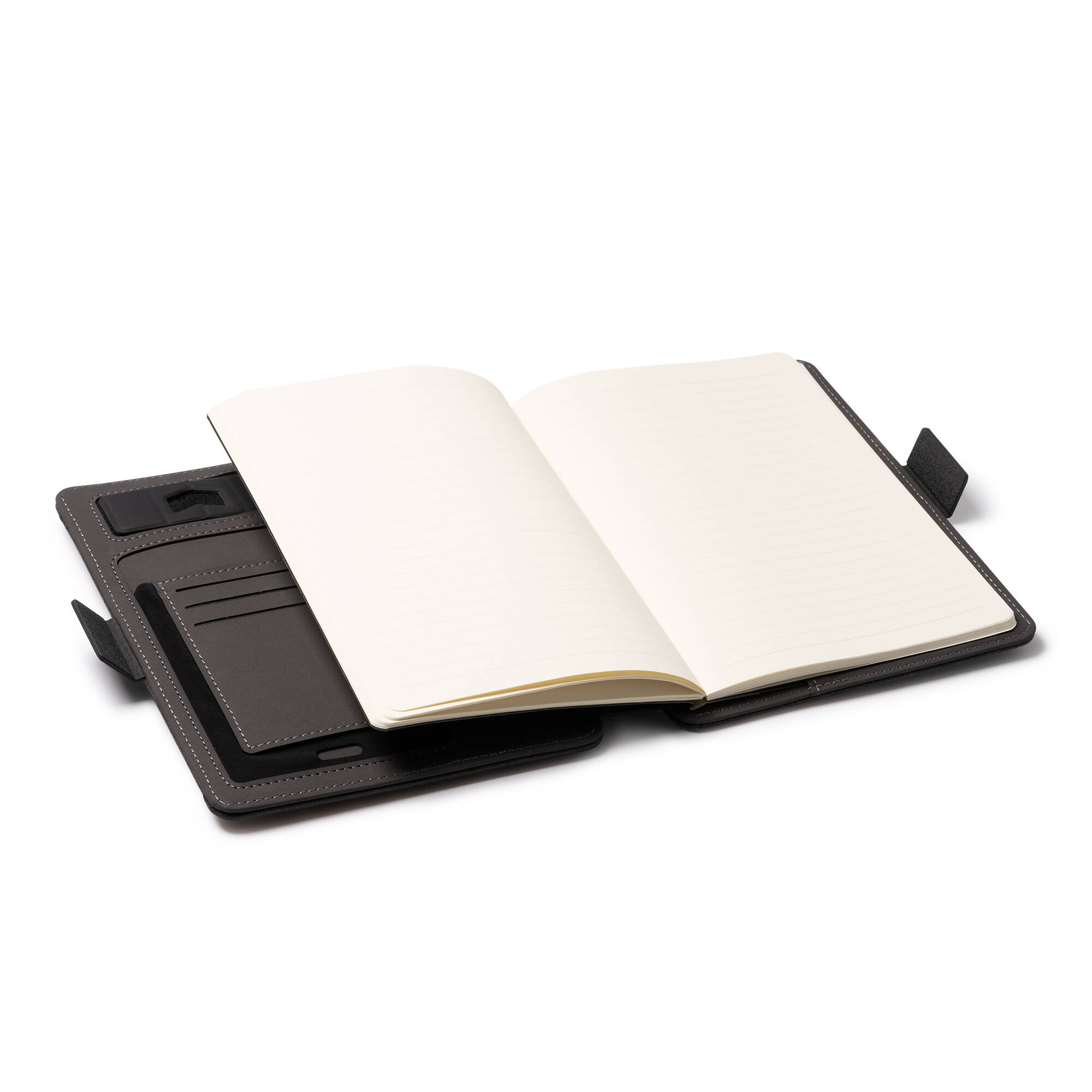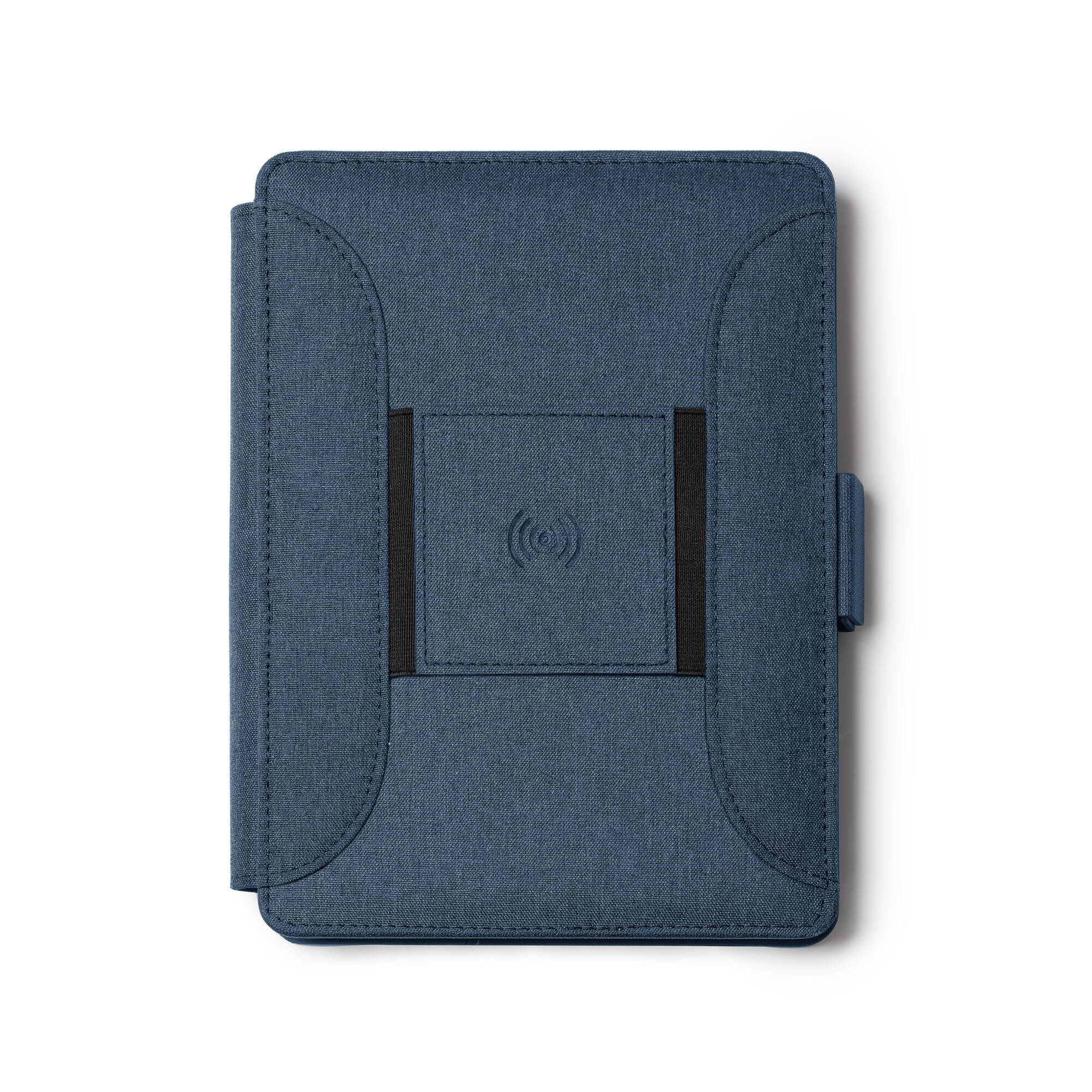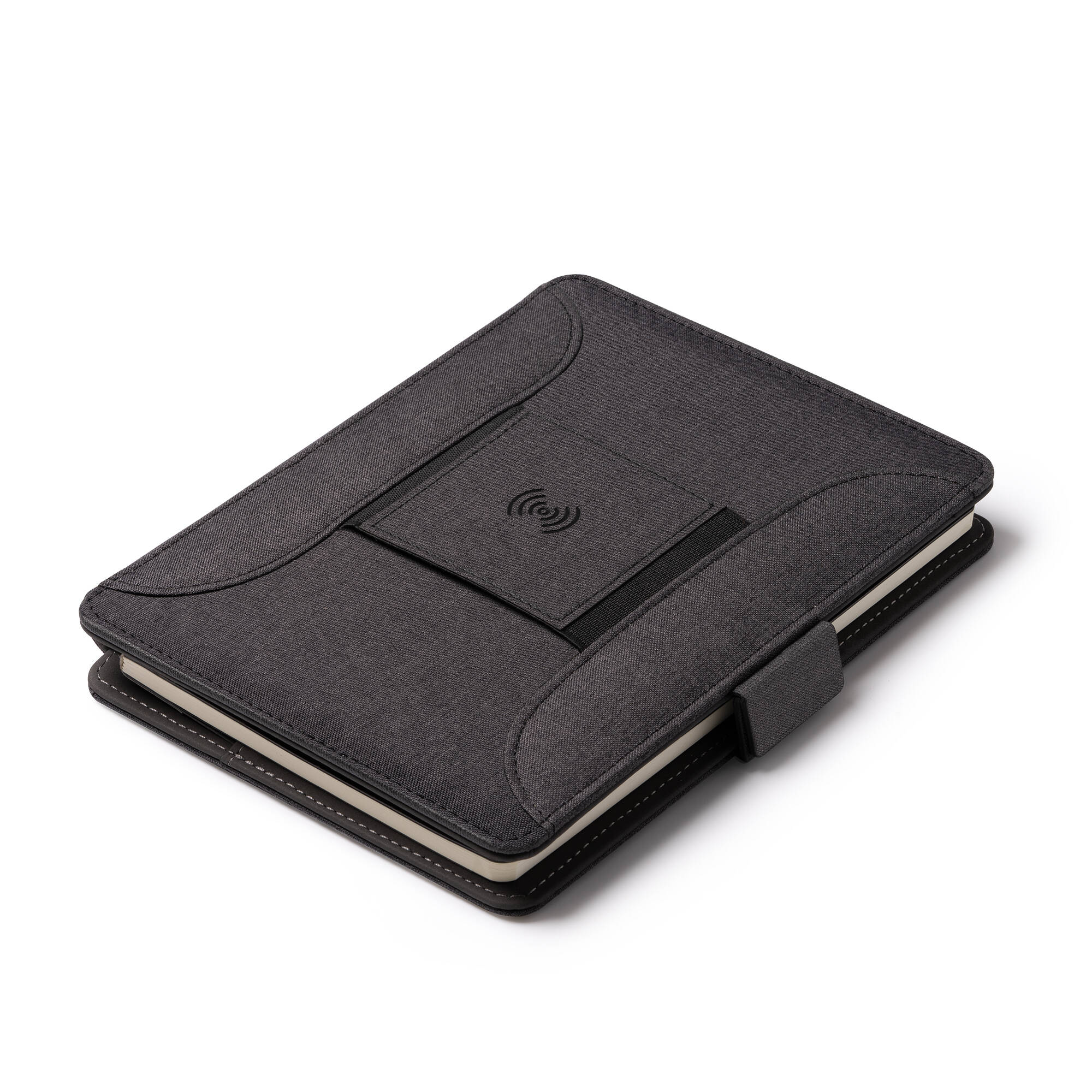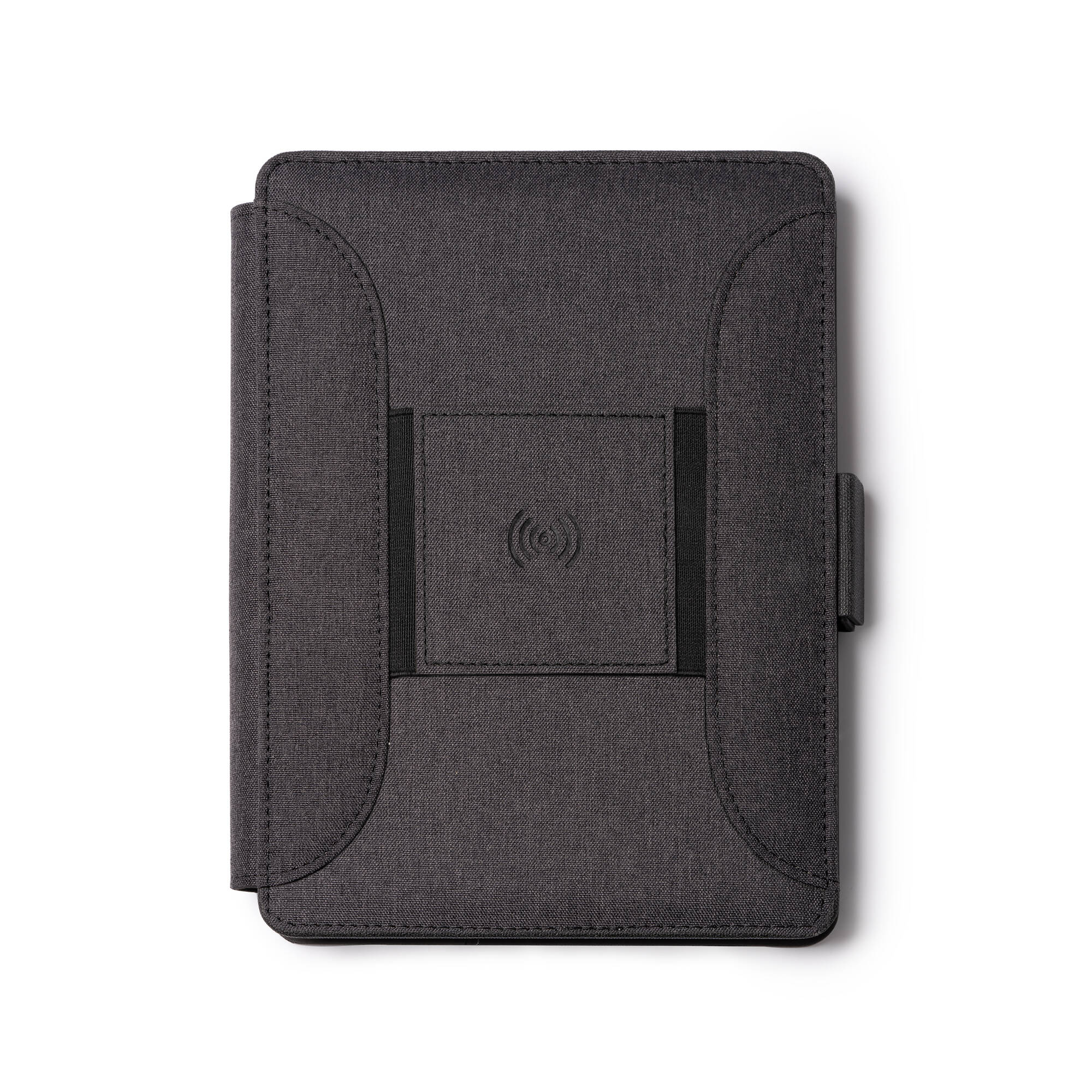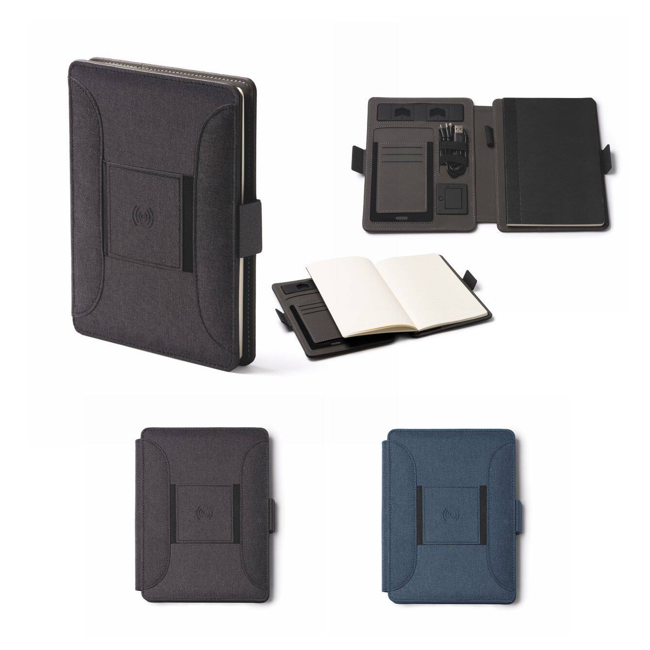 Cartellina multifunzione A5 RPET con chiusura magnetica, caricabatterie wireless integrato nella copertura, blocco note rimovibile con 56 fogli e scomparto per cellulare, è dotata anche di un pratico portapenne e portacard. E' incluso un cavo con 3 ingre