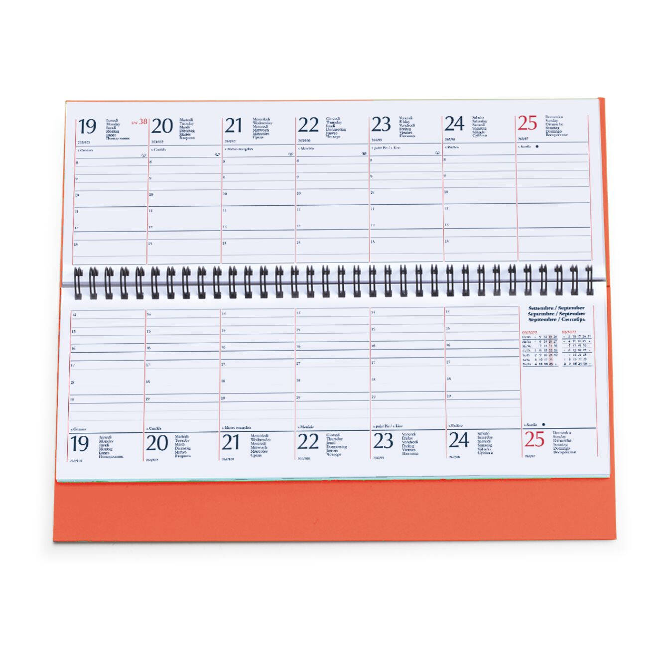 Planning spiralato in matra. 128 pagine. Carta usomano bianca 70 gr. Interno stampa 2 colori, datato. Colori: verde, cielo, verde acqua, royal, arancio, bianco. Dimensioni cm 30x15 Imballo: 20xcolore