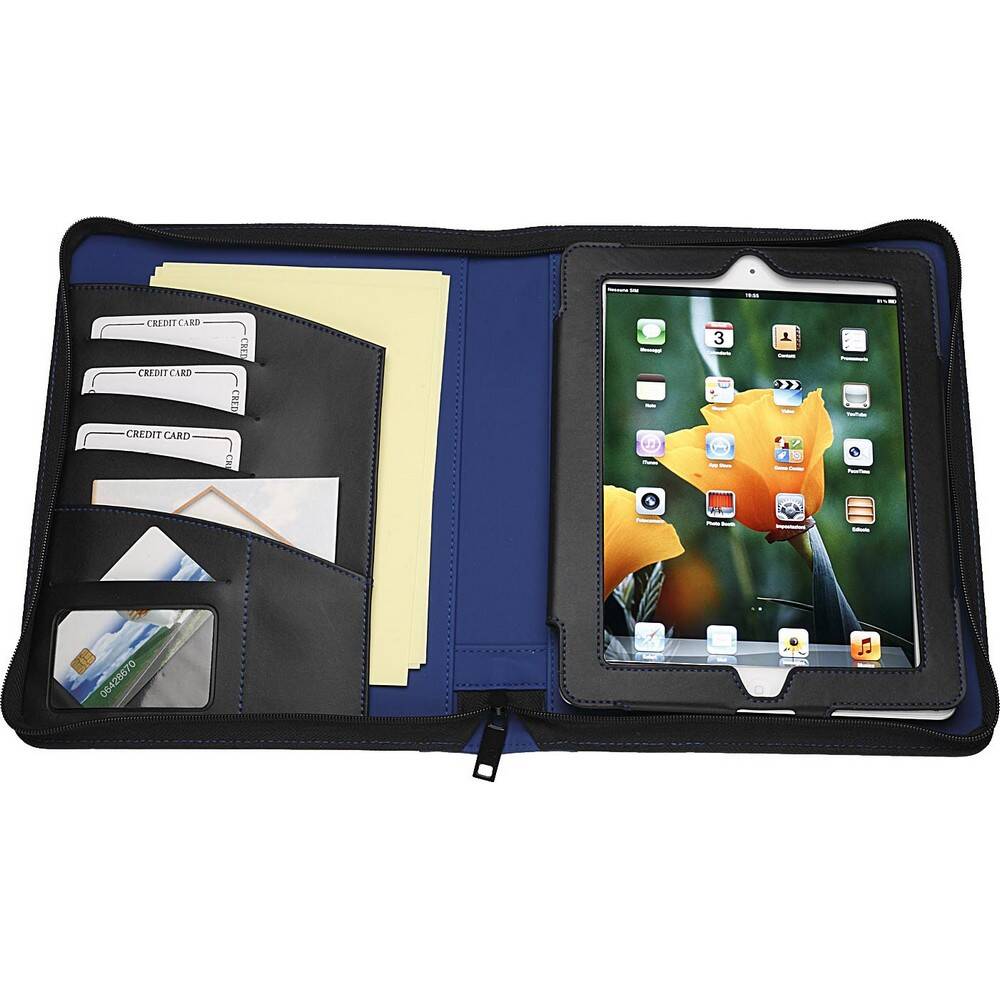 Cartella bicolore porta tablet in PU Varie tasche interne porta documenti, porta card. Chiuso da - zip. Colore: blu. Confezione in astuccio. Dimensioni cm.23x27,5