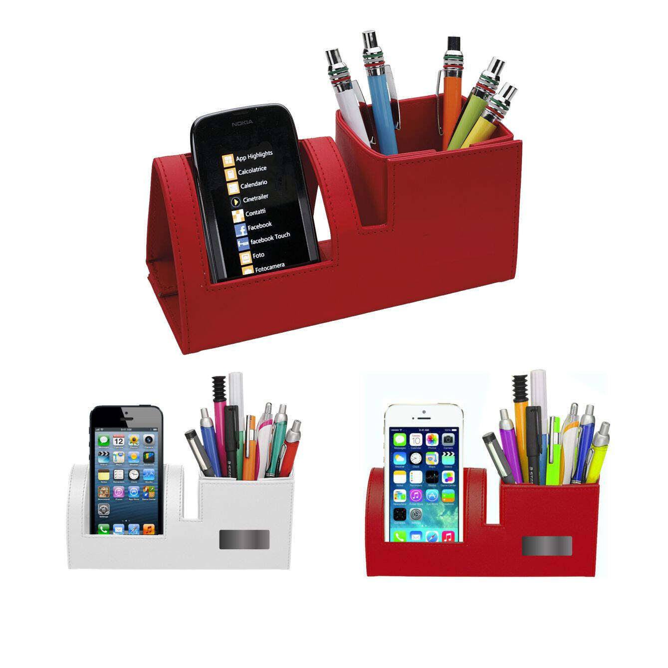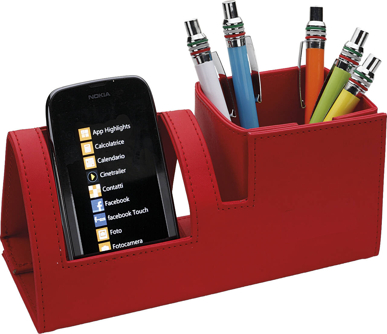 Porta penne-porta cellulare in similpelle. Colori: bianco, nero, rosso. Confezione in astuccio. Dimensioni cm.19,5x9x7,5 Imballo: 50xcolore