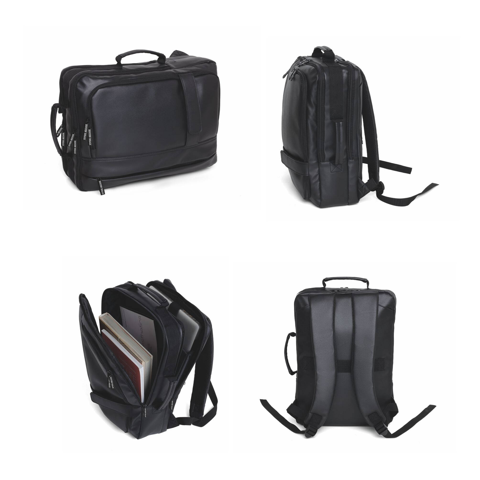 Zaino/Borsa Bruin Bear Portacomputer 15 con 2 manici per utilizzo come borsa o come zaino, schienale e spallacci imbottiti e rientrabili, due ampi scomparti centrali imbottiti, doppia tasca frontale, tasca sul retro porta tablet, sistema aggancio trolley. In PU morbido effetto pelle. Dimensioni: cm 30x43x14. Imballo: 10pz.