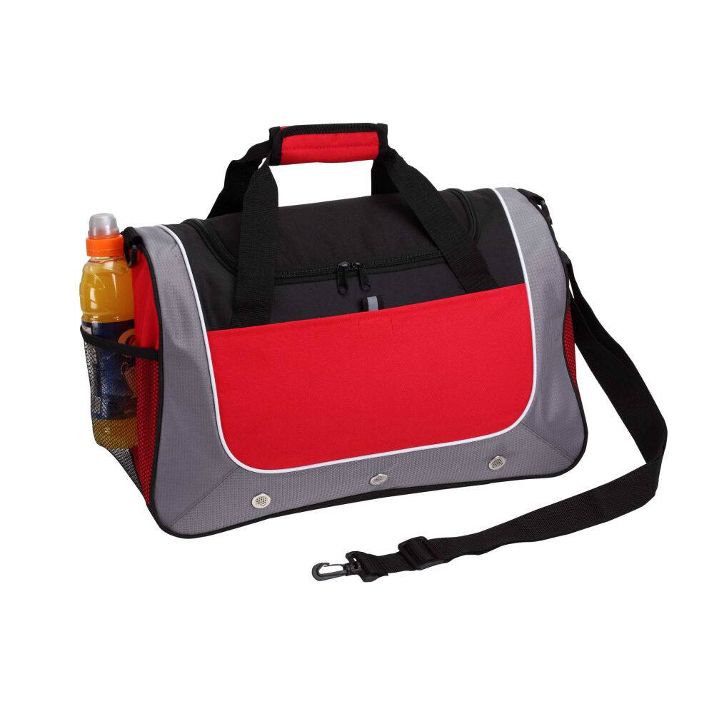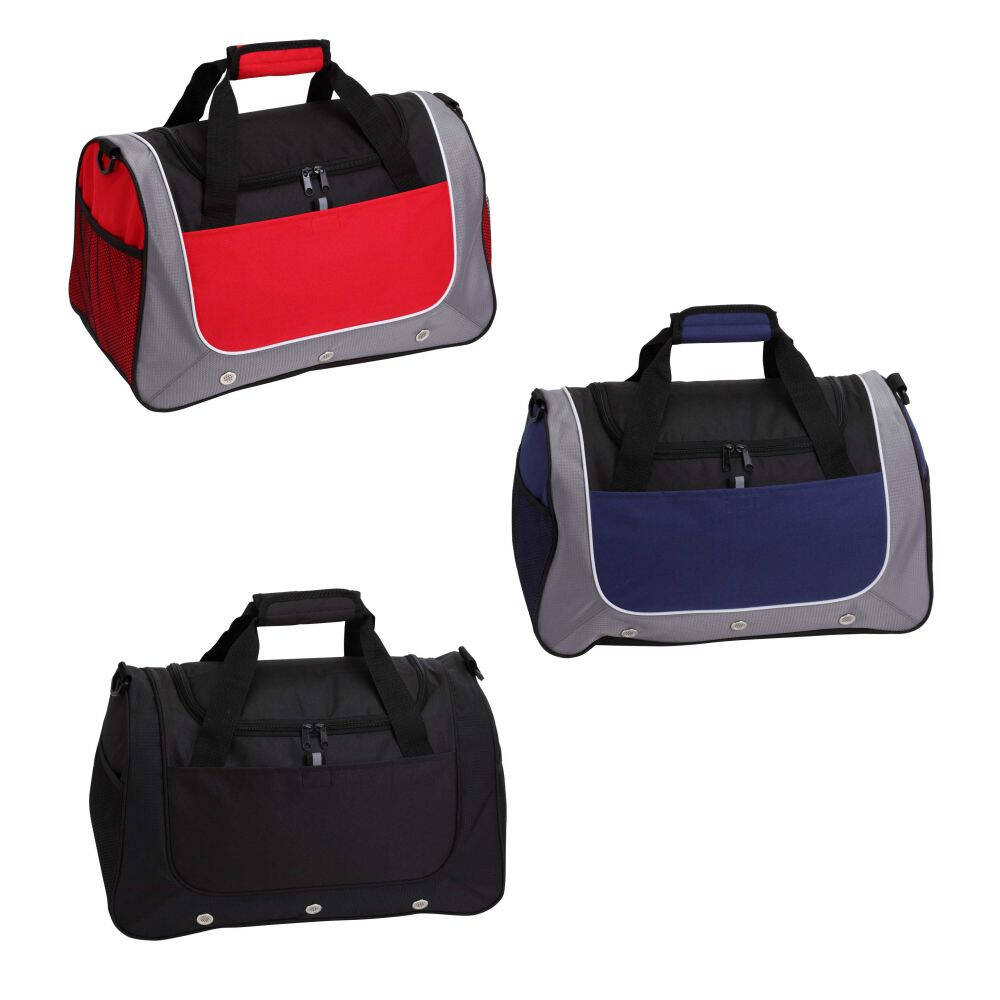 Borsa palestra poliestere 600D chiusura con doppio cursore. Tasche laterali in rete mesh, tasche frontali. Doppio manico chiuso da velcro. Tracolla regolabile e rimovibile. Asole traspiranti. Colori: rosso, nero, blu. Confezione in polybag. . Dimensioni cm. 47x23,5x28 Imballo : 20xcolore