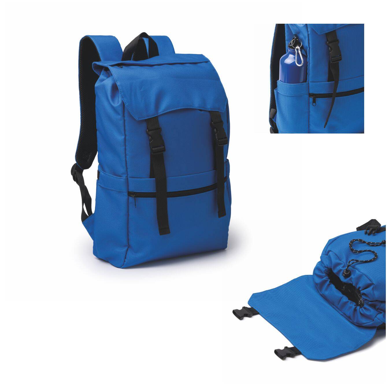 Zaino con patta in RPET 600D. Patta con chiusure regolabili. Scomparto principale con tasca interna per laptop da 15. Tasca esterna sulla patta e tasca frontale con chiusura a zip e 2 tasche laterali con elastico. Manici e schienale imbottiti. Dimensioni: cm 28,5x43x11,5. Versatile, elegante e pronta a seguirti ovunque.