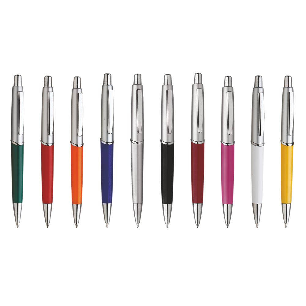 Penna sfera a scatto in plastica con clip di metallo. Fusto colorato e silver. Refill nero. Colori: vedi catalogo/sito. Imballo: 1000xcolore