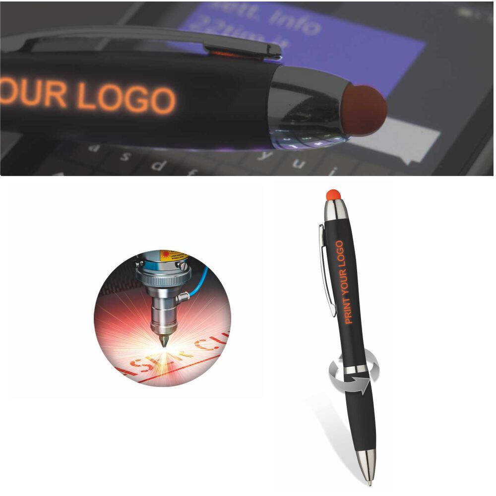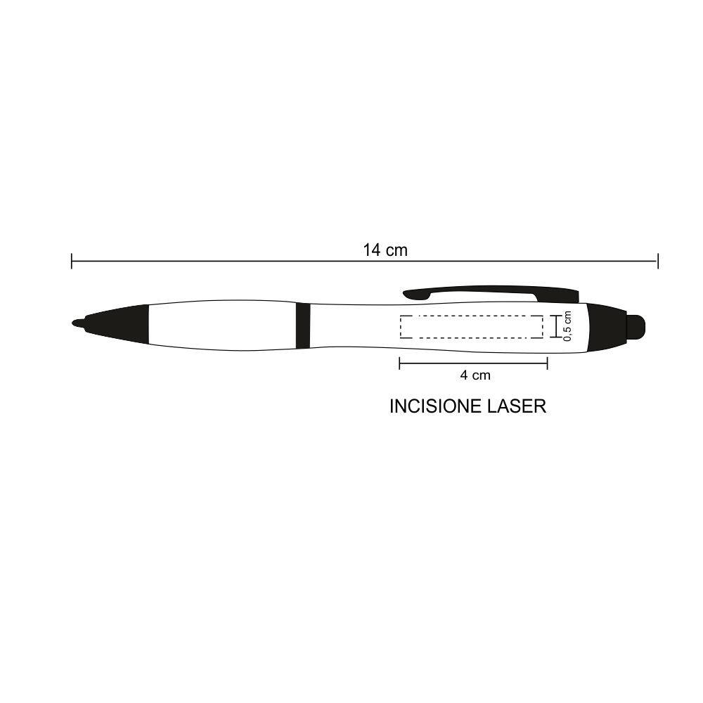 Touch pen con led a scatto rotante, in plastica. Clip in metallo. Refill nero Con incisione il lo-go avrà il colore degli inserti di gomma. Colori vedi catalogo/sito. Imballo: 1000xcolore