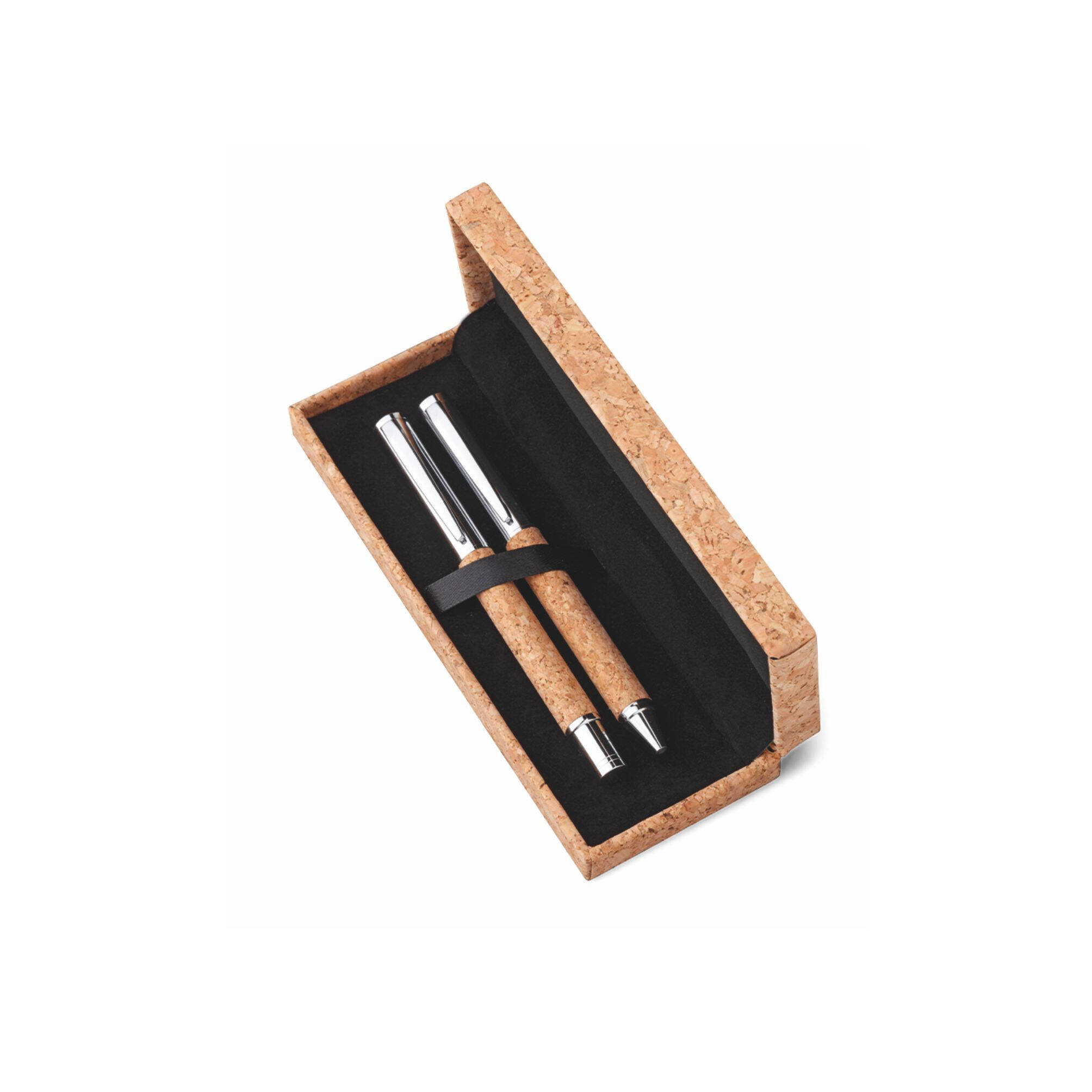 Parure composto da penna a sfera refil nero e penna gel in sughero e metallo. Confezione in astuccio di sughero. Dimensioni: astuccio 17,3x6,3 penne 13,5 cm. Imballo: 25pz.
