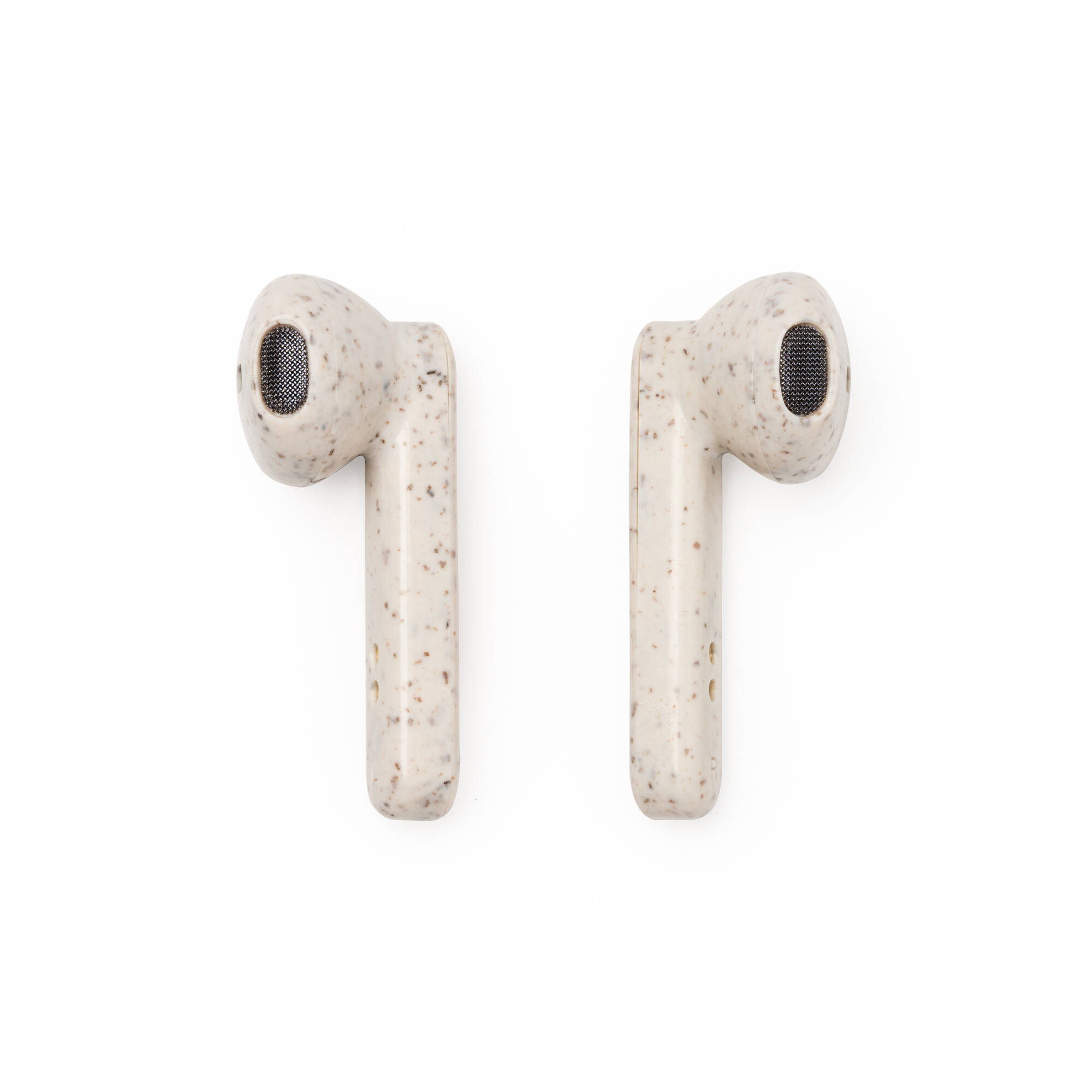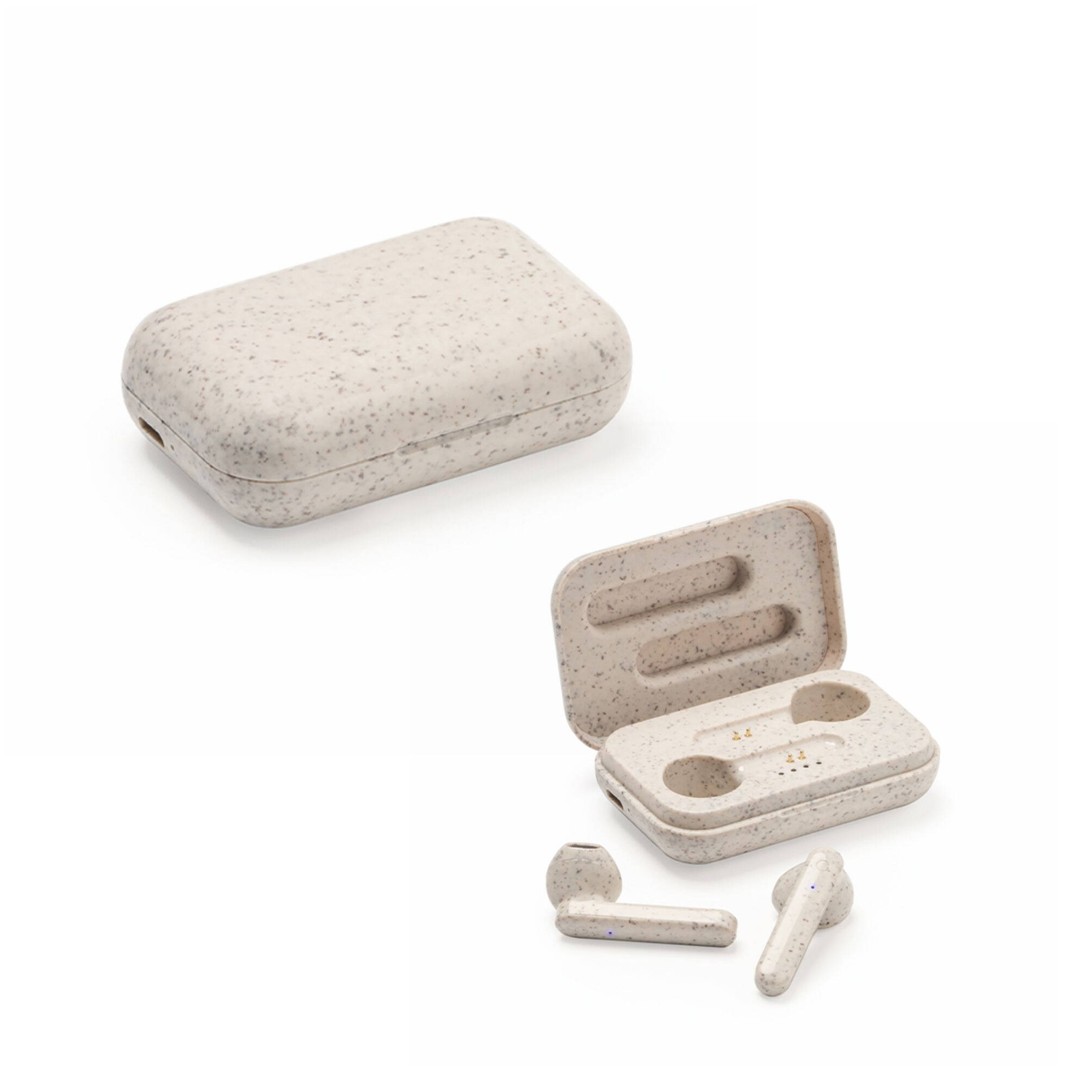 Auricolari wireless in fibra di grano. Custodia di ricarica. Pannello di controllo con tecnologia touch integrato nell’auricolare, funzione vivavoce, custodia con batteria ricaricabile e coperchio magnetico, cavo incluso. In scatola eco design. Dimensioni: cm 6,8x2,2x4,5. Imballo: 100pz.