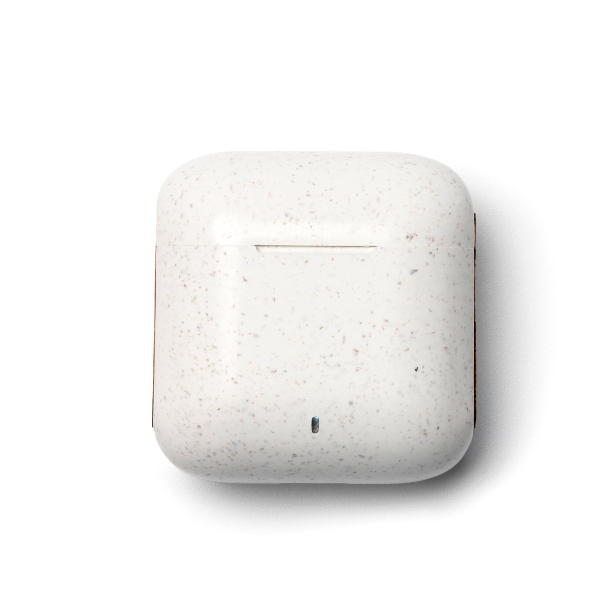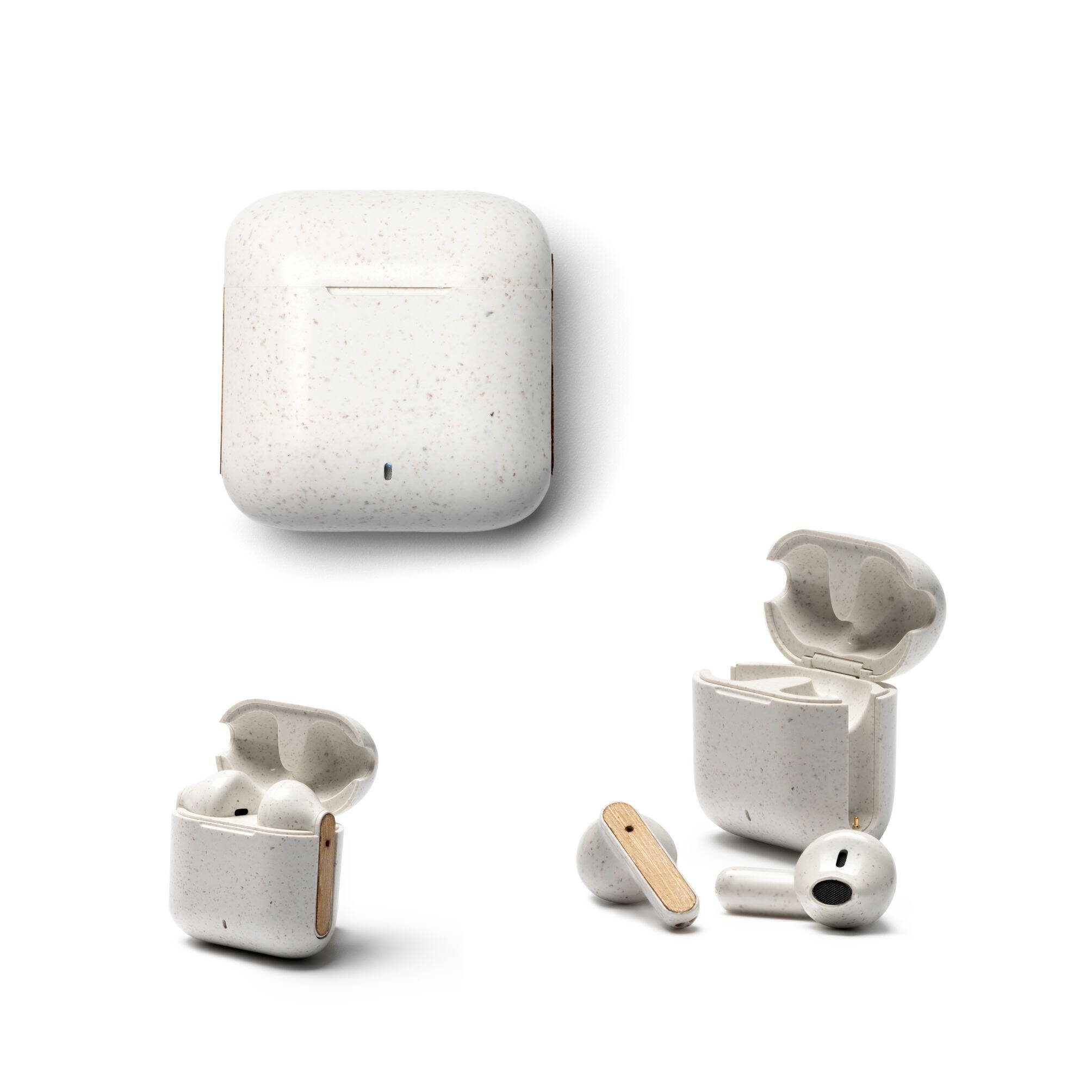 Auricolari wireless in fibra di grano e bamboo, con custodia di ricarica, pannello di controllo integrato con tecnologia touch, batteria ricaricabile, cavo di tipo C incluso. In scatola eco design. Dimensioni: cm 3,9x2,3x3,7. Imballo: 100pz.