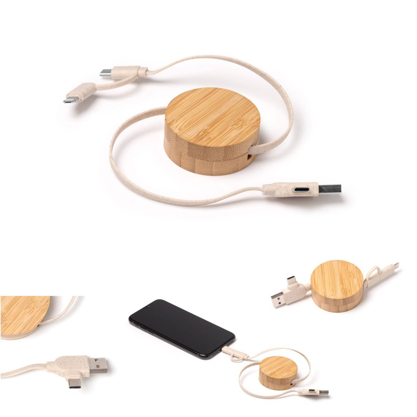 Cavo di ricarica estensibile con struttura principale in bambù e cavo in fibra di grano. Ingressi USB e di tipo C. Uscite lightning e di tipo C. Presentazione in una busta individuale di design ecologico. Dimensioni: cm 22x1,9Ø