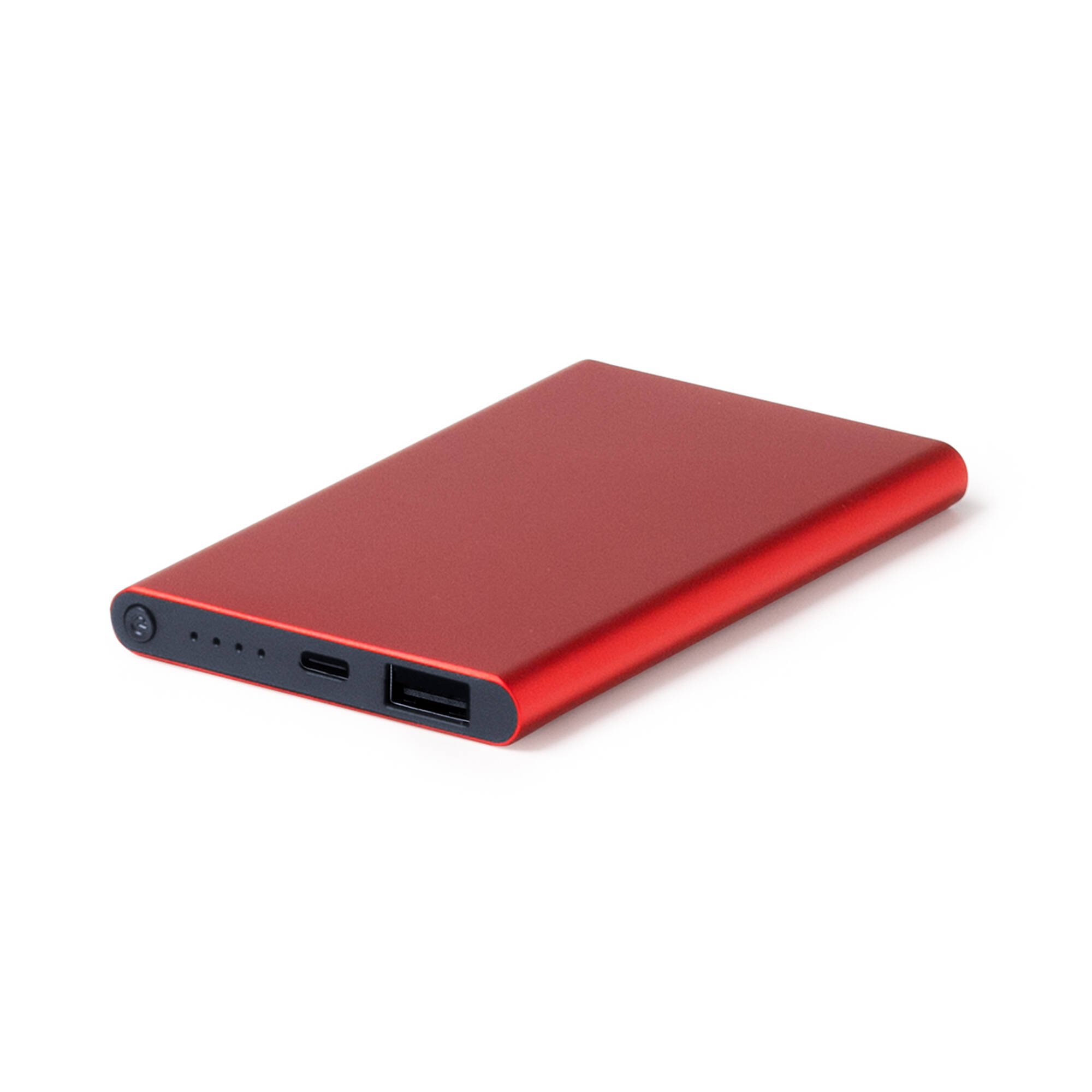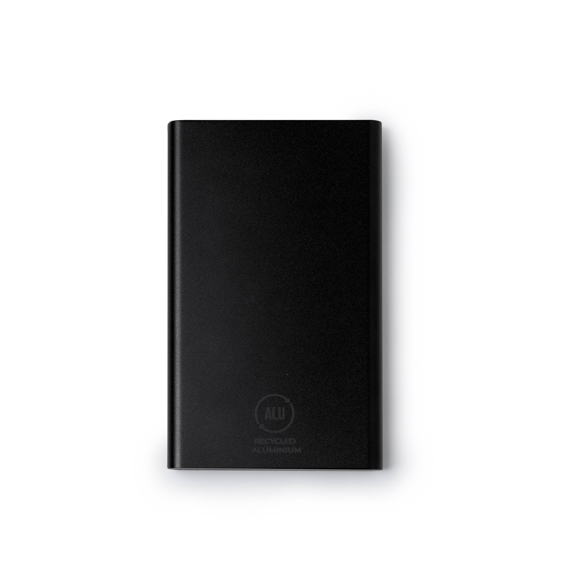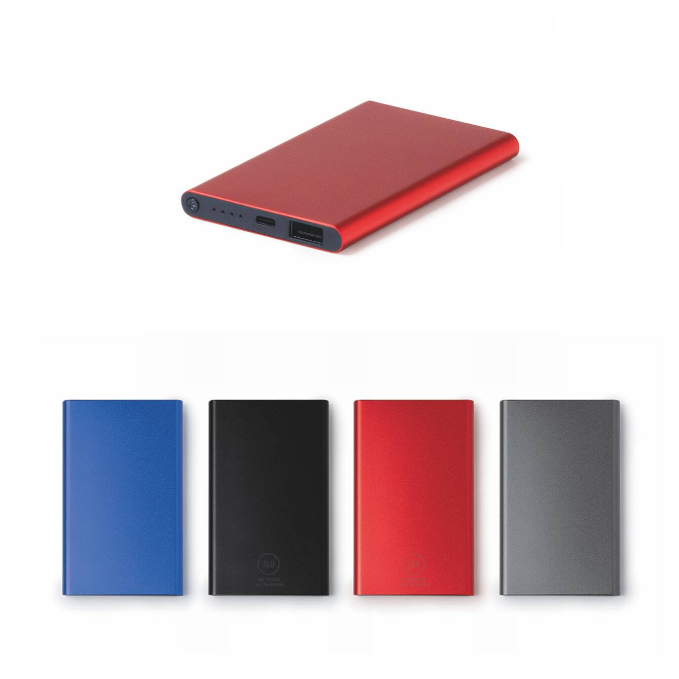 Power bank in alluminio riciclato. Capacità di 4.000 mAh. Indicatore LED. Uscita DC5V/2,1A. Cavo di tipo C incluso. Confezione in scatola di design ecologico. Dimensioni: cm 6,5x11x0,9