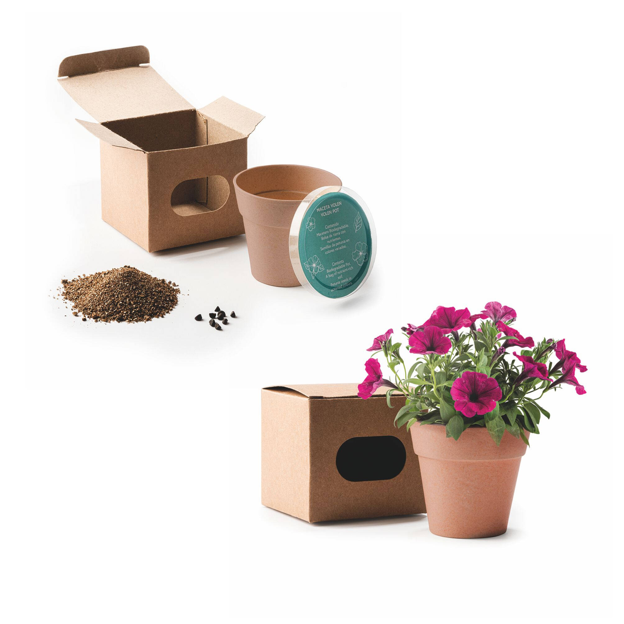 Vaso con semi di petunia e fioriera biodegrada bile. Include substrato. Dimensioni: cm 6x6,4. Imballo: 200pz.