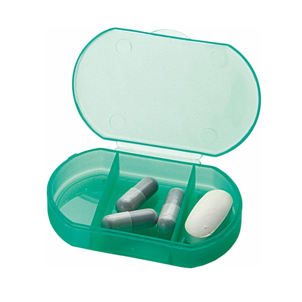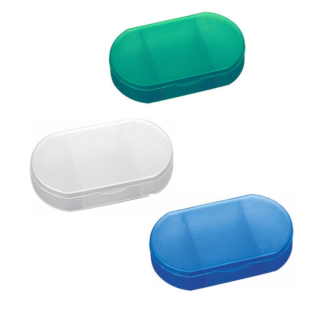 Portapillole a 3 scomparti. In plastica. Colori: verde, bianco, royal. Confezione in polybag. . Dimensioni cm 6x3,5x1,3 Imballo: 200xcolore