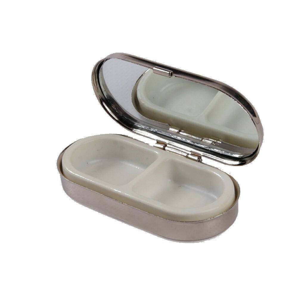 Portapillole in alluminio con specchio, doppio scomparto. Colore unico. Confezione in polybag. Dimensioni cm. 6,7x3 Imballo: 200