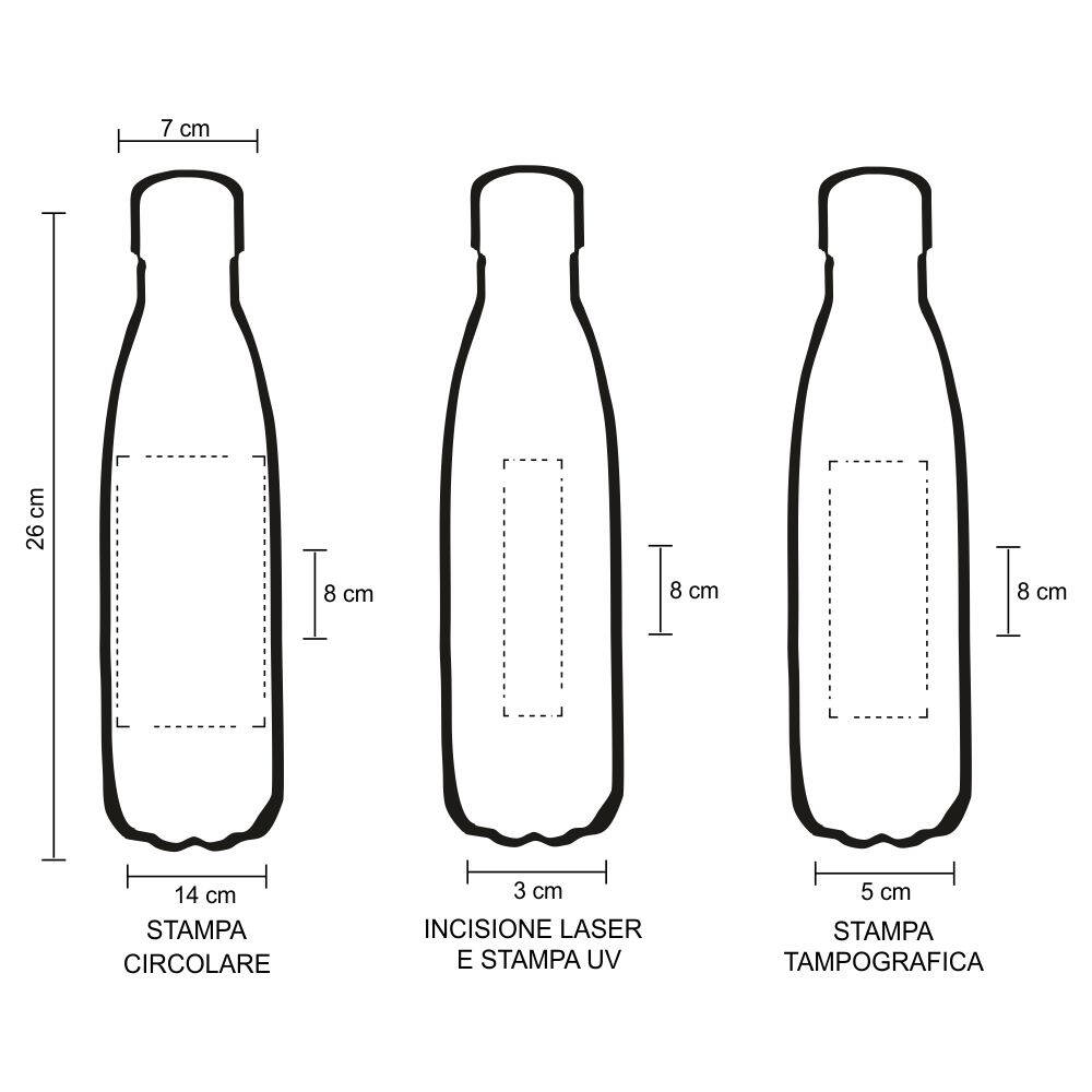 Borraccia termica doppia parete in Acciaio Inox 304, capacità: 500ml. - 12H caldo 24H freddo. - Dimensioni: Ø 7cm. - h 25,8cm. - Imballo: 50 - Borracce confezionate singolarmente con scatola