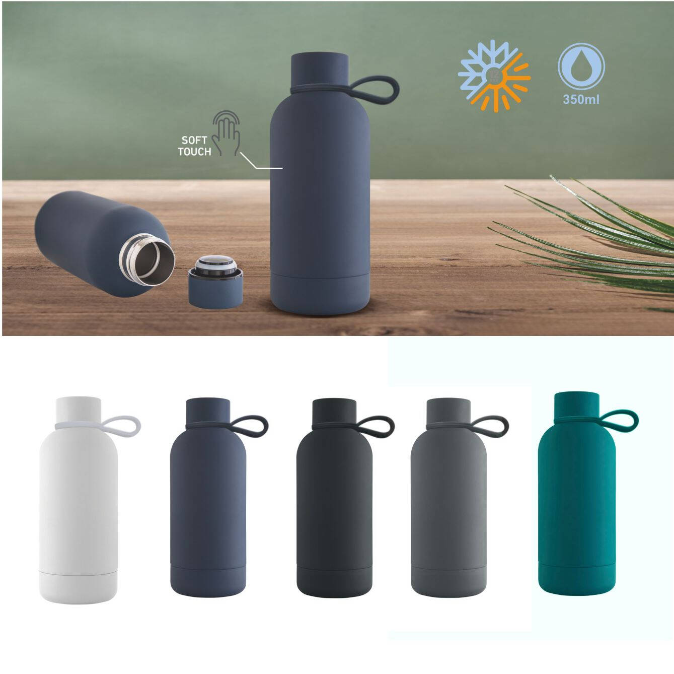 Borraccia da 350ml in acciaio Inox 304 con doppia parete e finitura soft touch. Confezione in astuccio. Dimensioni: cm 7,4 H 18,2. Imballo: 25pz.