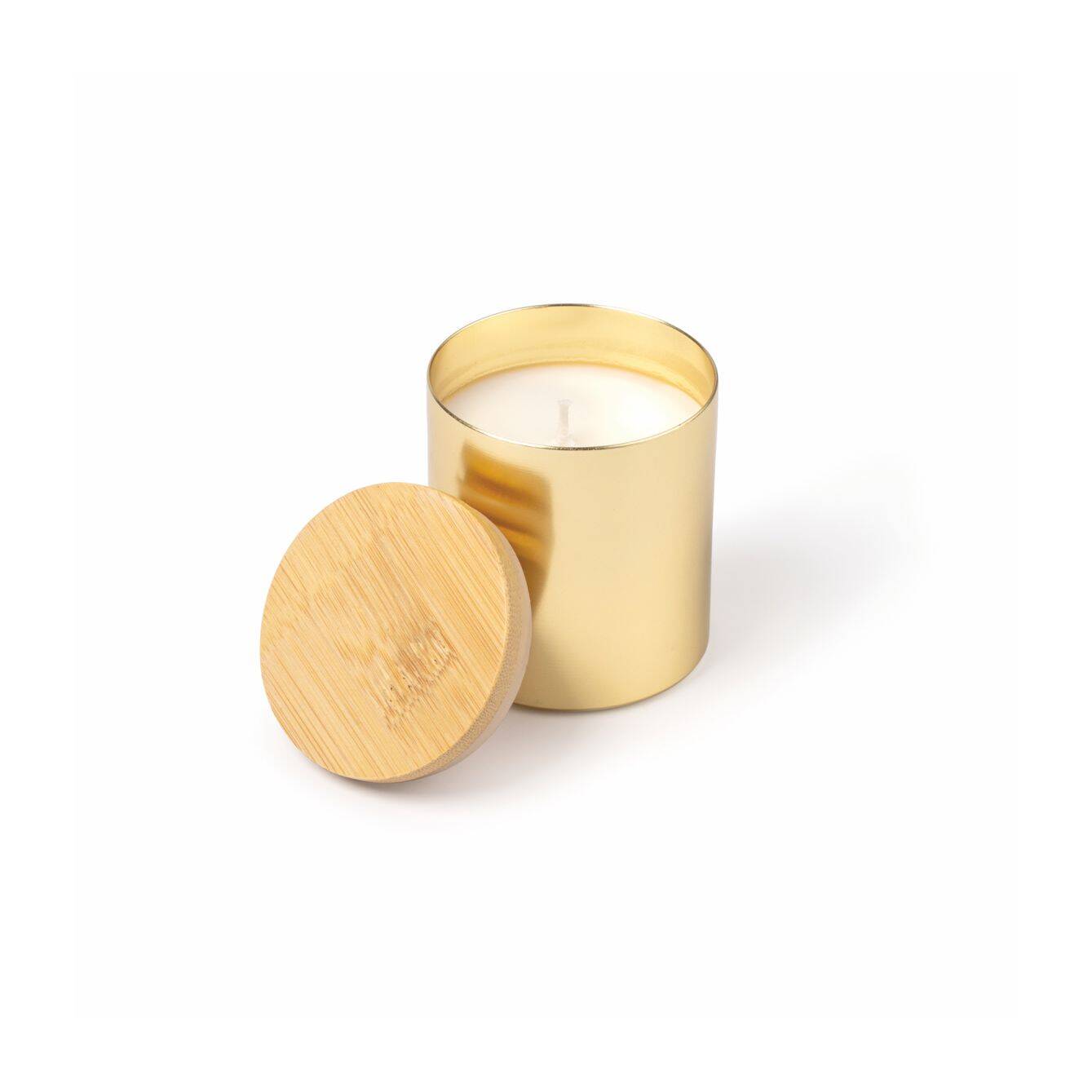 Candela profumata contenuta in un elegante contenitore in alluminio con finitura metallica e coperchio in bamboo. Con un buon profumo di vaniglia, perfetta per creare un'atmosfera calda e accogliente. Dimensioni: cm 7,5x6,5Ø. Versatile, elegante e pronta a seguirti ovunque.