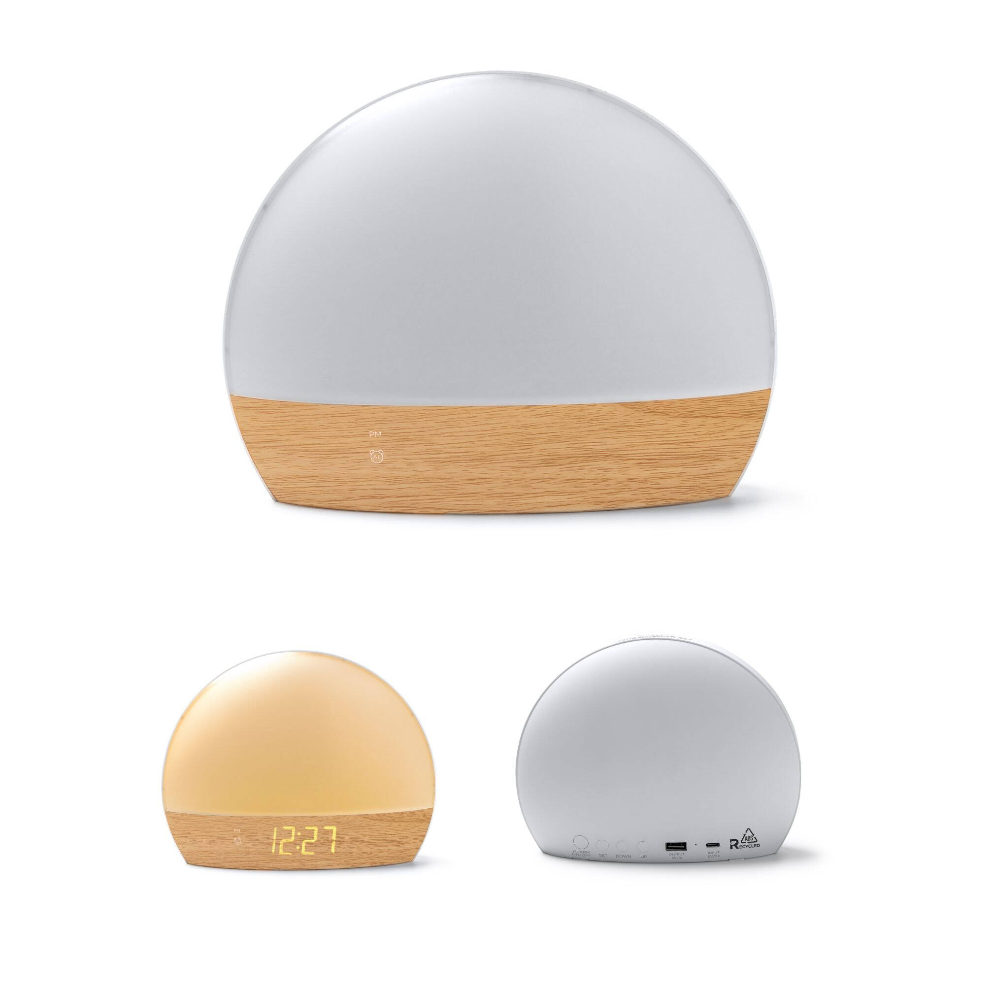 Lampada sveglia in ABS riciclato con modalità di illumi nazione progressiva, funzionalità: ora, data e temperatura, luce a LED in diversi colori, cavo incluso. Confezione in scatola eco design. Dimensioni: cm 18,5x14,4x6,6. Imballo: 30pz.
