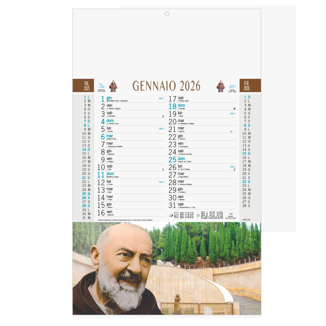 Calendario “San Pio”. Trimestrale 12 fogli + retro. Testata pressofusa carta patinata. Dimensioni: cm 28,8x47, testata cm 28,8x9. Imballo: 100
