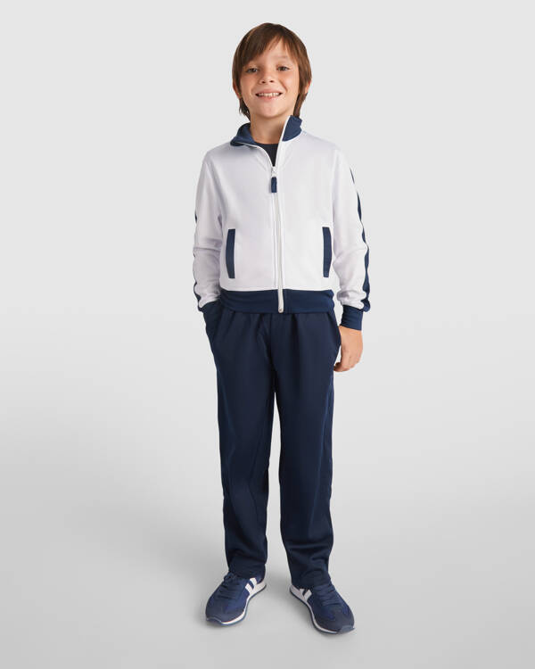 Tuta composta da giacca e pantaloni. 1.- Collo alto con protezione zip. 2.- Tasche frontali in contrasto colore. 3.- Polsini e vita in costina 1x1 in contrasto colore. 4.- Zip centrale con cuciture ricoperte . 5.- Pantaloni con elastico in vita e cordoncino regolabile con impuntura di sicurezza e due ampie tasche laterali . 6.- Interni in velluto molto confortevoli. 7.- Cerniere sulle caviglie dei pantaloni.