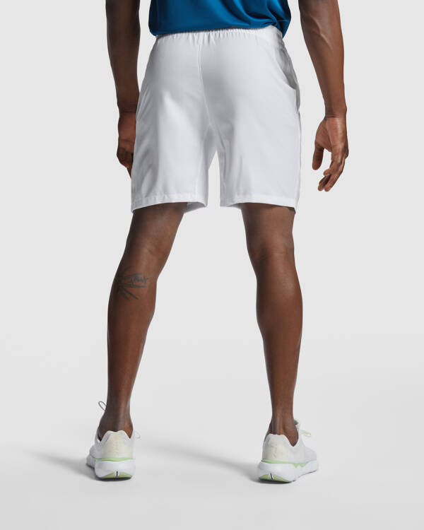 Pantaloni sportivi corti con tasche laterali. Elastico in cintura con cordoncino per regolazione. Tessuto leggero e traspirante con interno in maglia di microfibra.