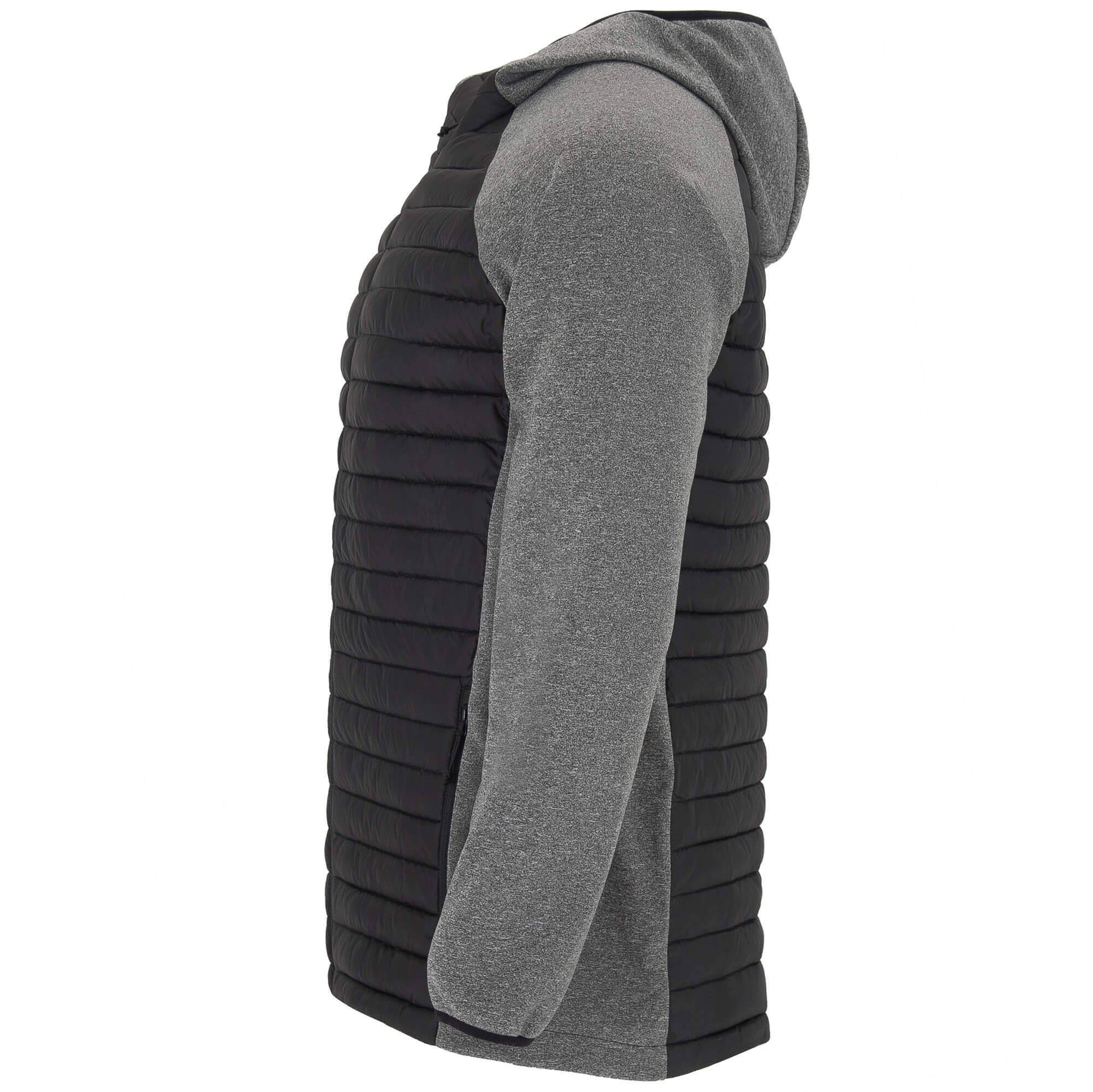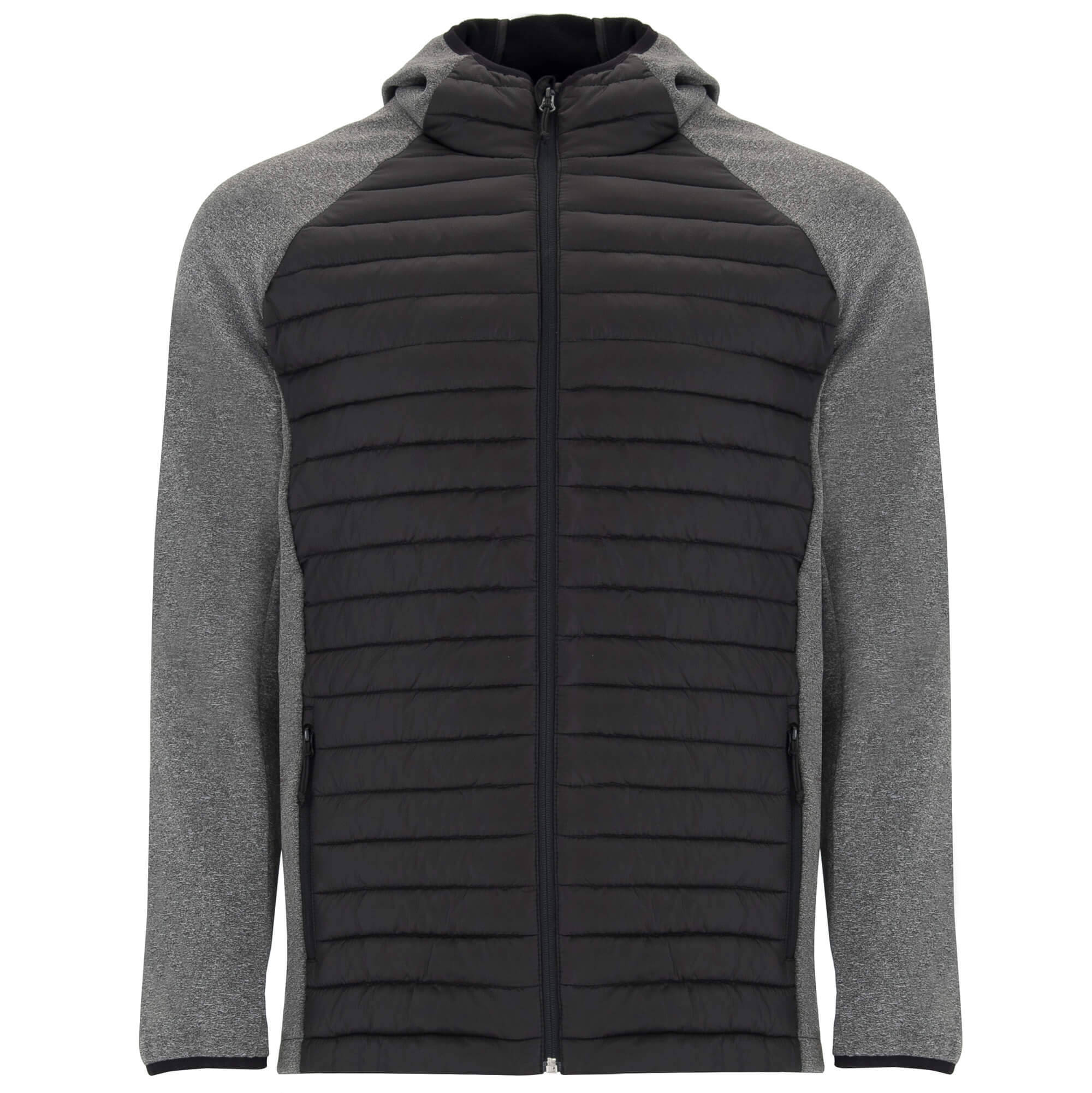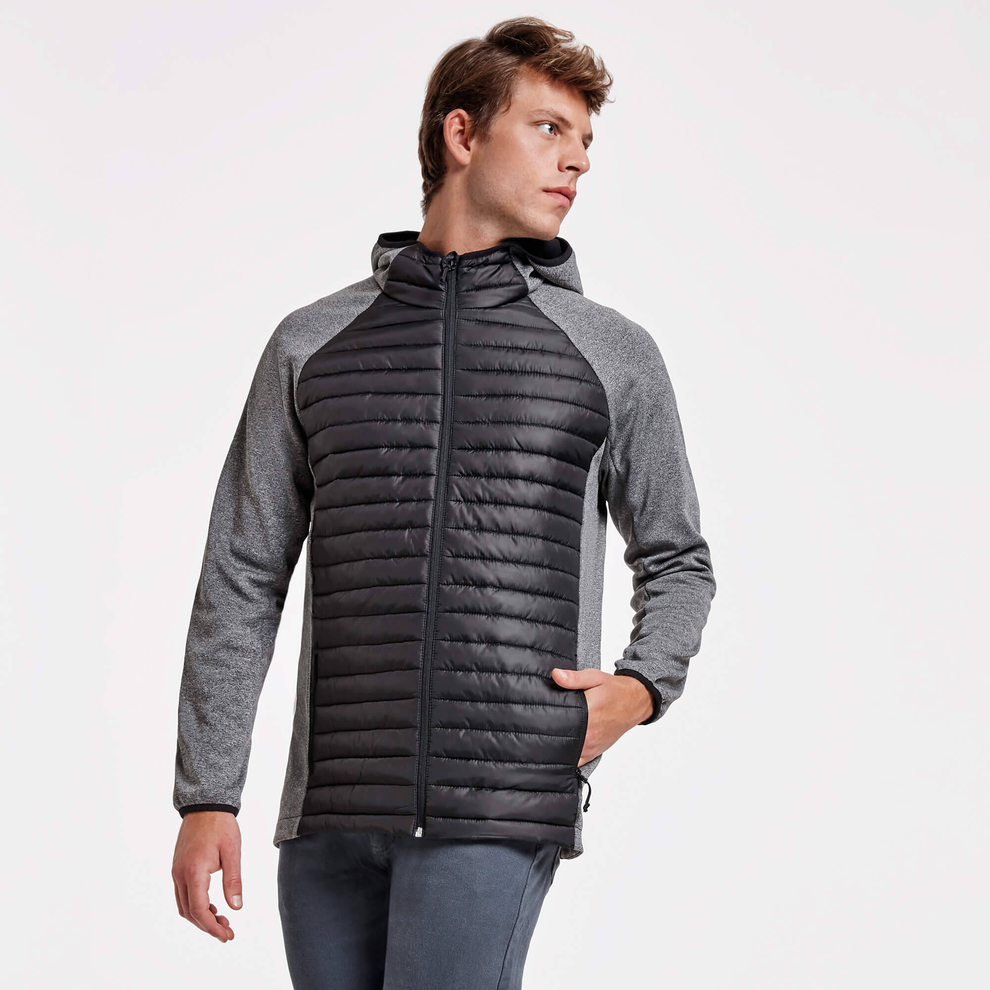 Giacca Giubbino da uomo composta da due tessuti: 1. Cappuccio fisso. 2. Manica stile ranglan. 3. Tessuto softshell nelle maniche, pannelli laterali e cappuccio. 4. Tessuto imbottito, tatto piuma nella parte frontale e nella schiena. 5. Cerniera invertita in tono con protettore per il mento e tiretto. 6. Due tasche frontali con cerniera. 7. Bordatura elastica in tono sul collo, polsini e girovita.