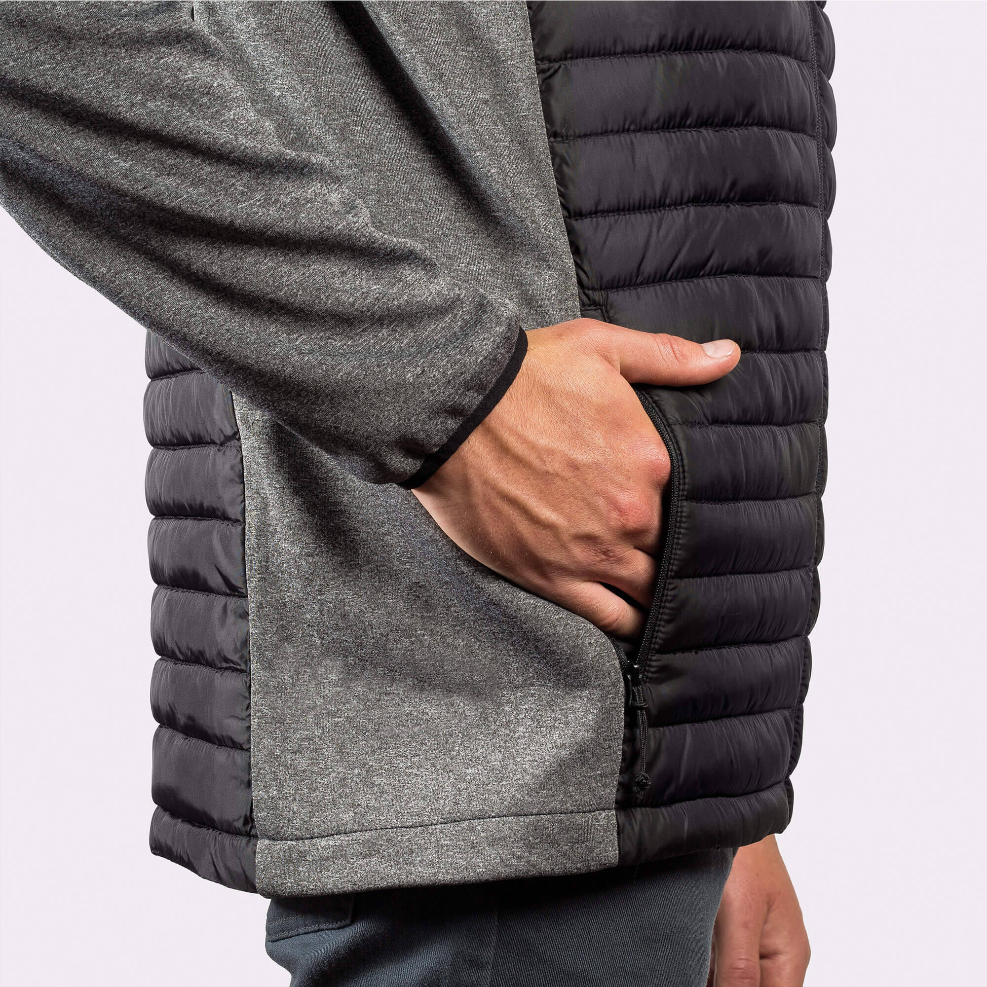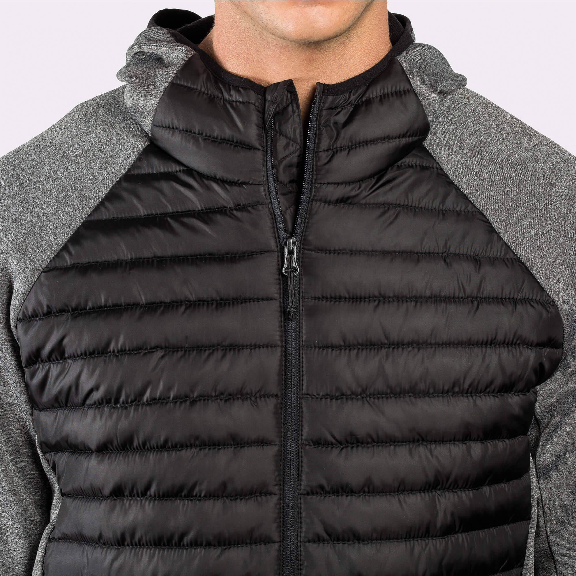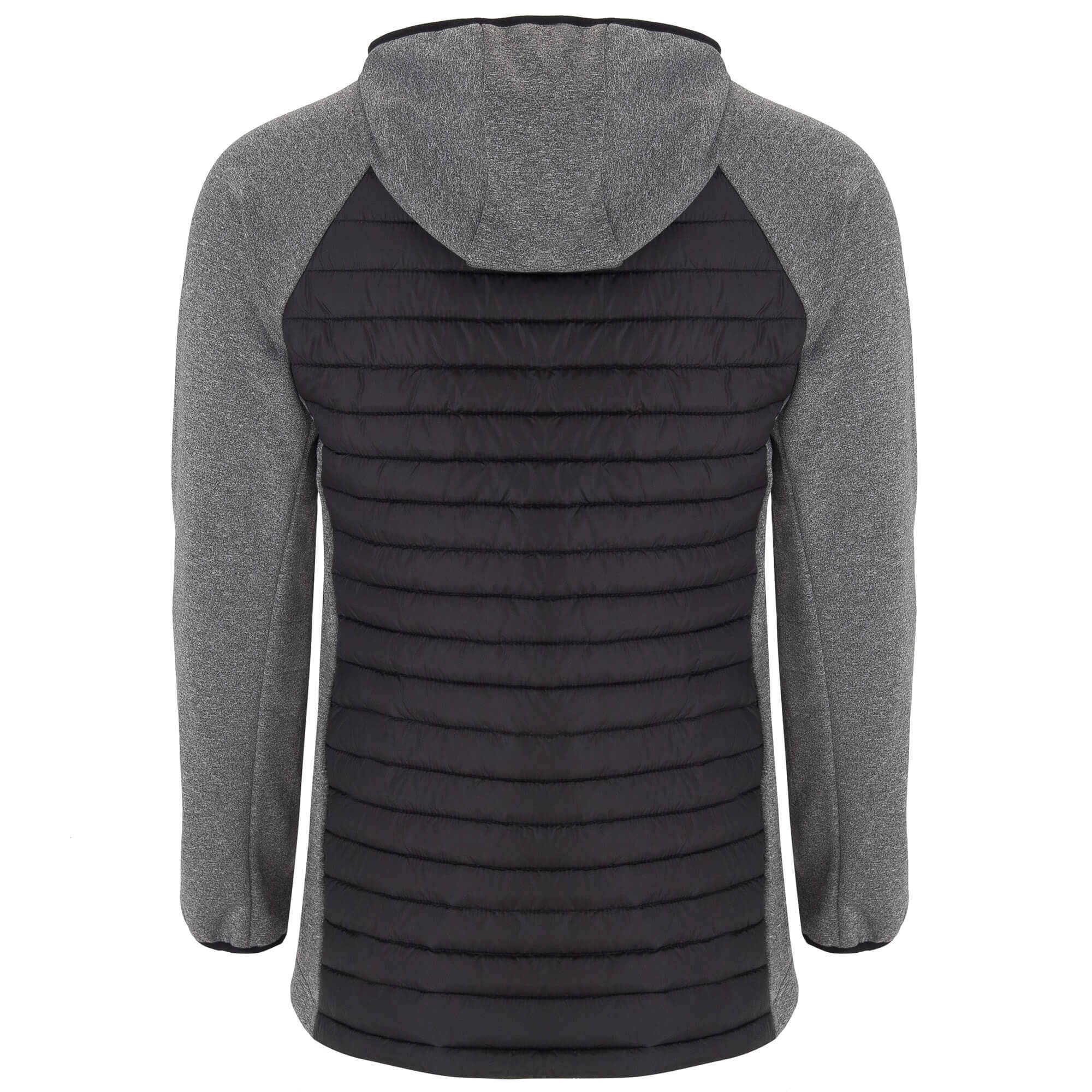 Giacca Giubbino da uomo composta da due tessuti: 1. Cappuccio fisso. 2. Manica stile ranglan. 3. Tessuto softshell nelle maniche, pannelli laterali e cappuccio. 4. Tessuto imbottito, tatto piuma nella parte frontale e nella schiena. 5. Cerniera invertita in tono con protettore per il mento e tiretto. 6. Due tasche frontali con cerniera. 7. Bordatura elastica in tono sul collo, polsini e girovita.