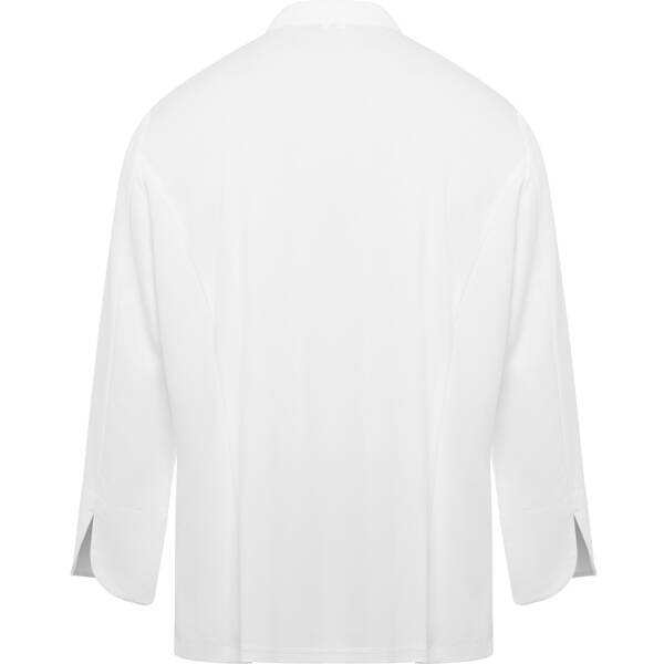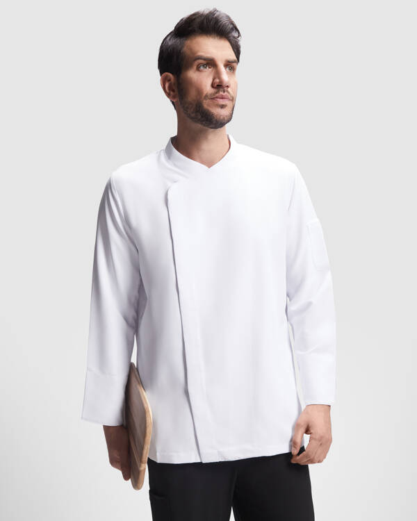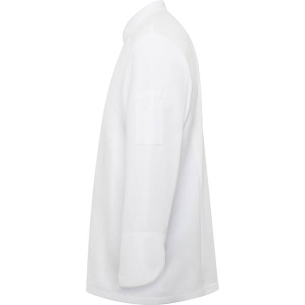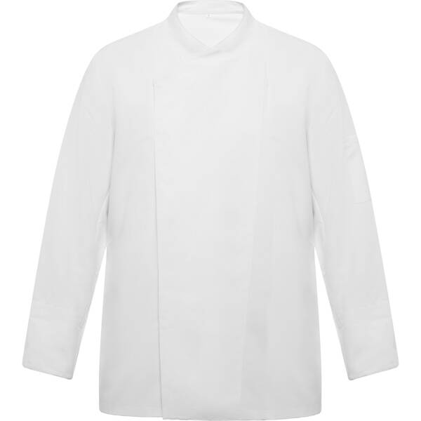 Giacca da cucina con maniche lunghe. Chiusura centrale incrociata con bottoni a pressione nascosti. Colletto rialzato e maniche su misura con polsini orlati. Retro in tessuto traspirante. Una tasca applicata sulla manica sinistra.