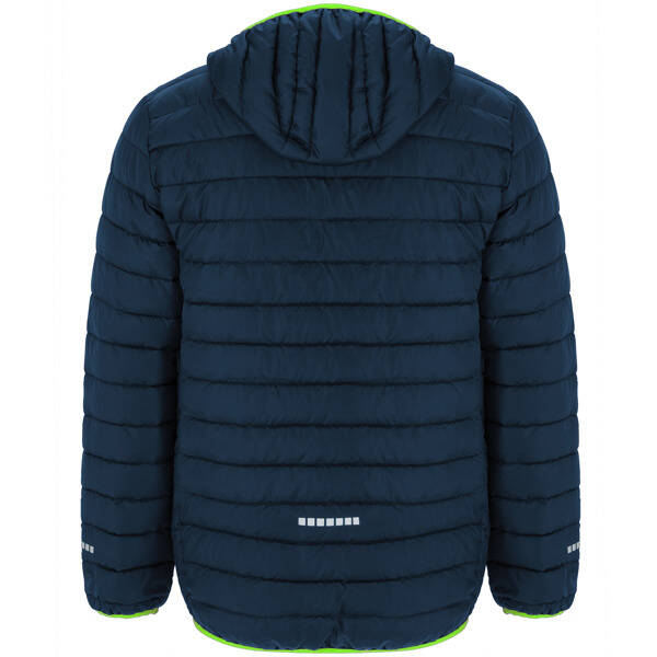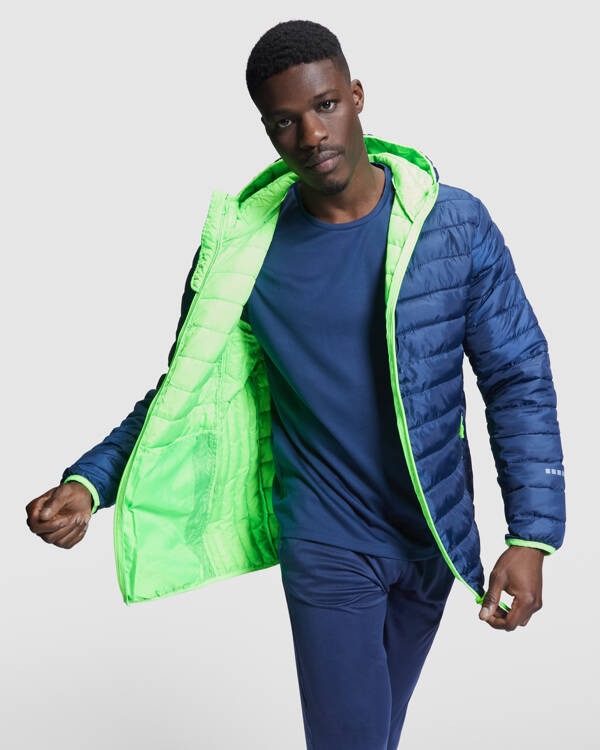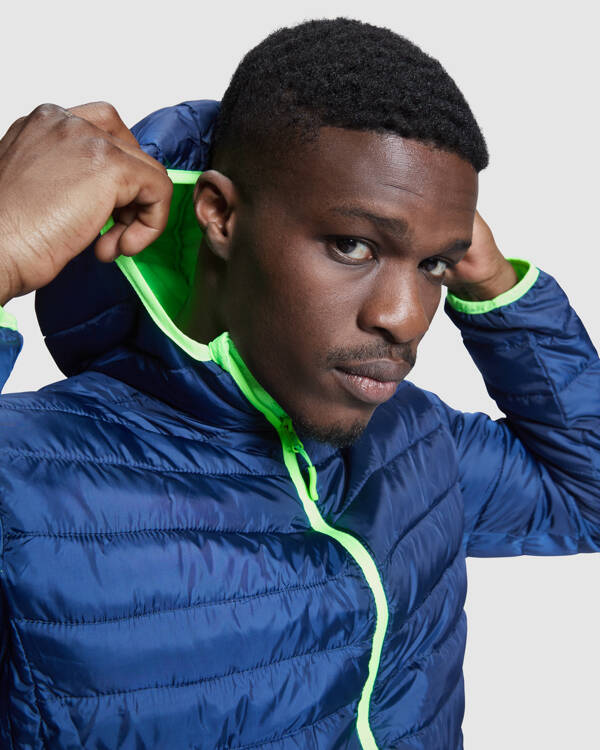 Giubotto sportivo con imbottitura tatto piuma. 1. Cerniera frontale invertita in contrasto con protettore per il mento e tiretto. 2. Cappuccio fisso. 3. Tasche laterali in contrasto con cerniera invertita e tiretto. 4. Dettagli riflettenti sulle maniche e schiena. 5. Parte inferiore più lunga di 4cm rispetto al Norway. 6. Cappuccio, polsini e parte inferiore con bordatura elastica in contrasto. 7. Include borsa per il trasporto.
