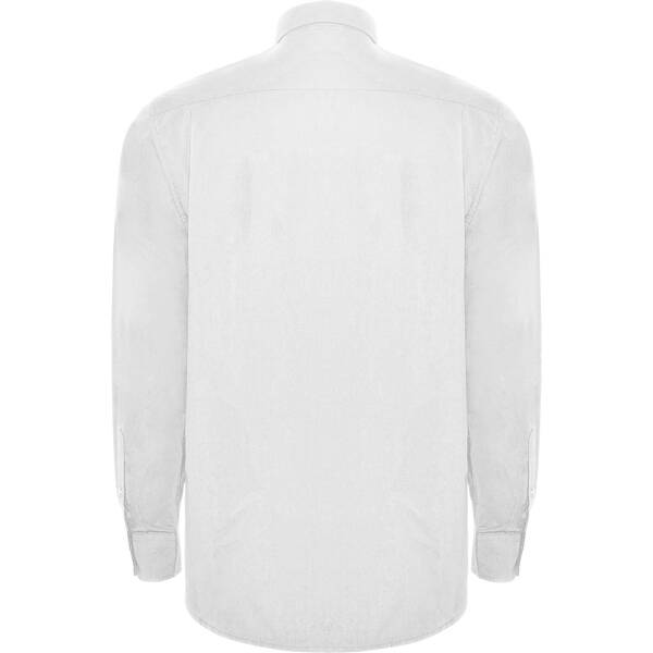 Camicia manica lunga, colletto classico inamidato 1 boton e tasca frontale lato sinistro. Abbottonatura con 7 bottoni in tinta. Bordo inferiore arrotondato.