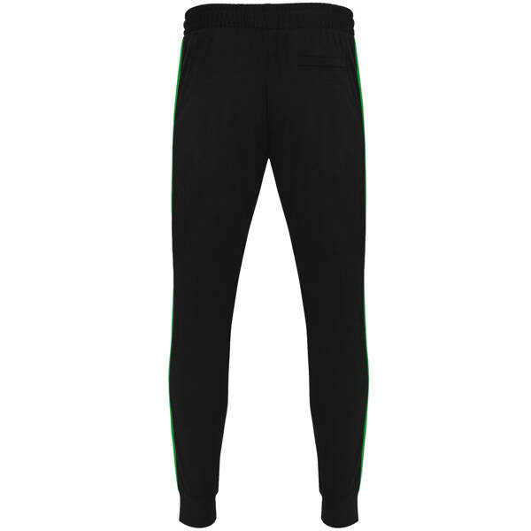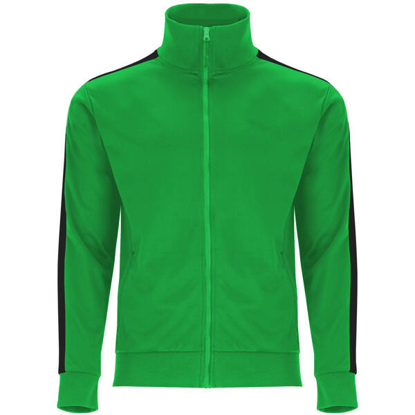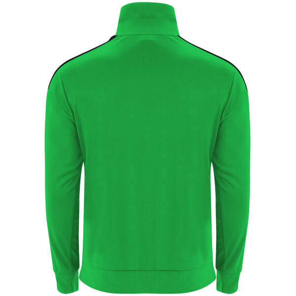 Tuta composta da giacca e pantalone: 1. Collo alto con copricuciture interne in tono. 2. Collo, polsini e girovita in costina 1x1. 3. Cerniera centrale in tono con tiretto. 4. Tasche laterali della giacca con cerniera. 5. Fascia laterale in contrasto. 6. Pantalone con cintura elastica e cordoni regolabili. 7. Due tasche laterali. 8. Tasca posteriore con cerniera. 9. Pantaloni con polsini elastici in costina 1x1.